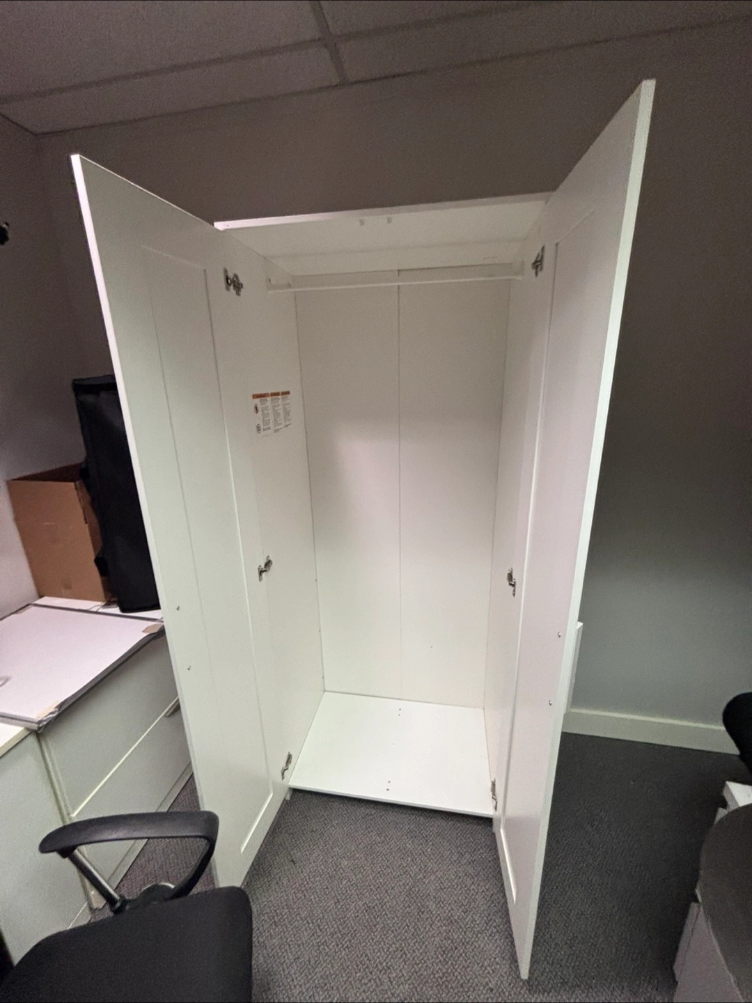 Selling an IKEA PAX wardrobe in white. It's in great condition and ready to organize your space! It features a hanging rod and a bottom shelf for storage. Perfect for any room!