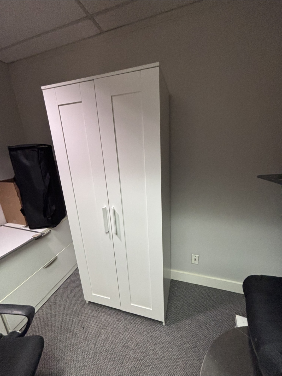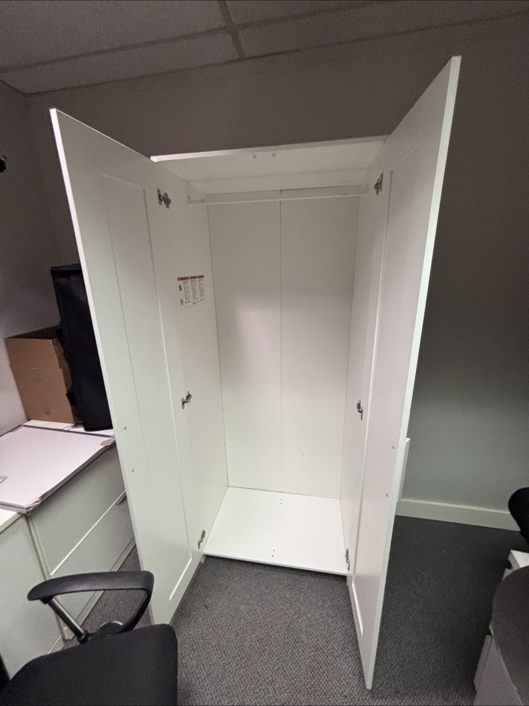 Selling an IKEA PAX wardrobe in white. It's in great condition and ready to organize your space! It features a hanging rod and a bottom shelf for storage. Perfect for any room!