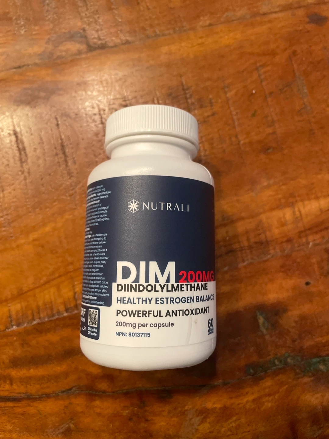 Nutrali DIM 200mg capsules for healthy estrogen balance and antioxidant support. Contains 200 mg of Diindolylmethane per capsule. This bottle has 60 capsules.