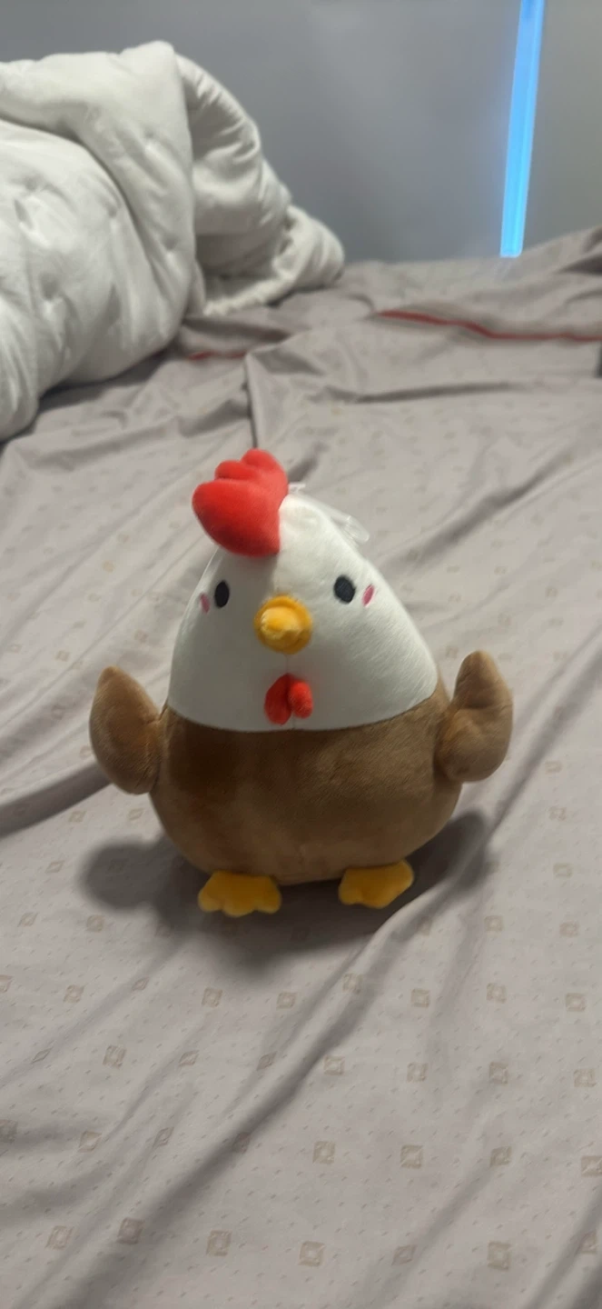 This is a cute plush chicken stuffed animal. It's soft and cuddly with a white body, brown wings and feet, and a red comb. Its friendly expression makes it a delightful companion!