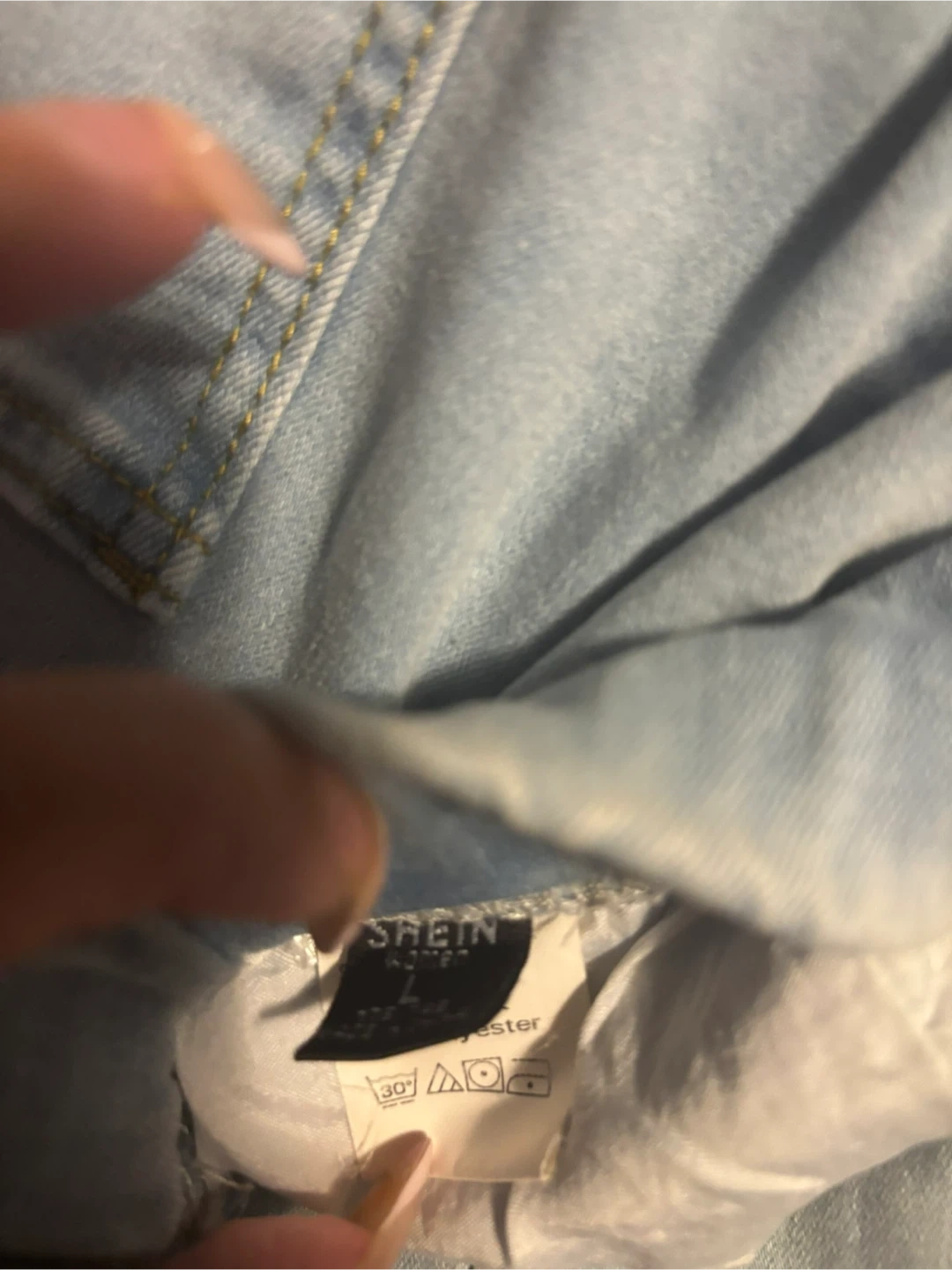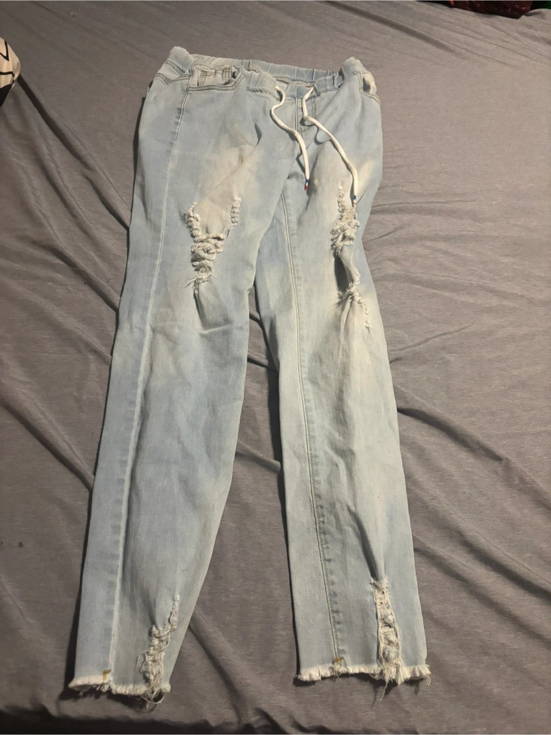 Selling a pair of light wash distressed denim jeans from Shein. They're a size large and have a drawstring waist. Great for a casual look!