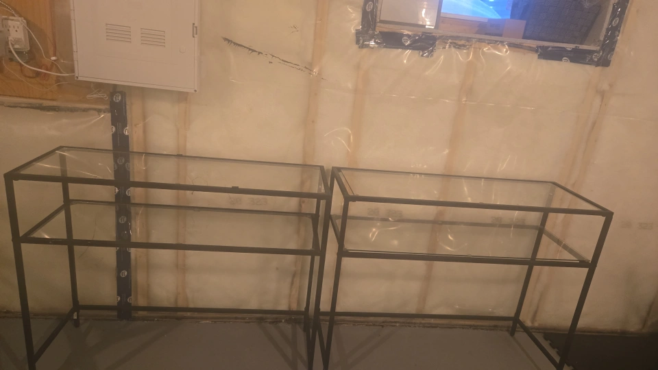 Two display shelving units with glass tops and metal frames. Each unit has two tiers. These are perfect for showcasing collectibles or merchandise. Metal frame construction or use as console tables