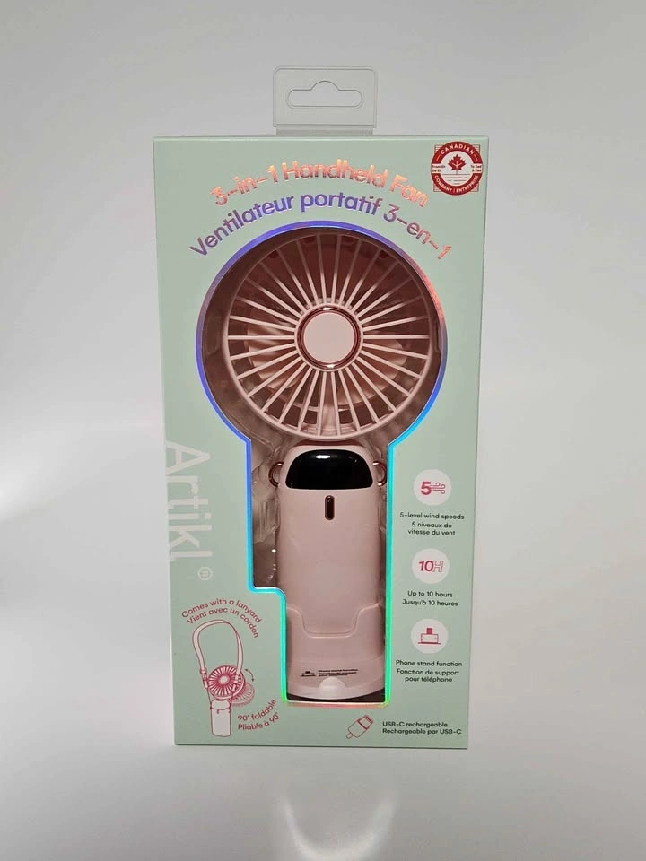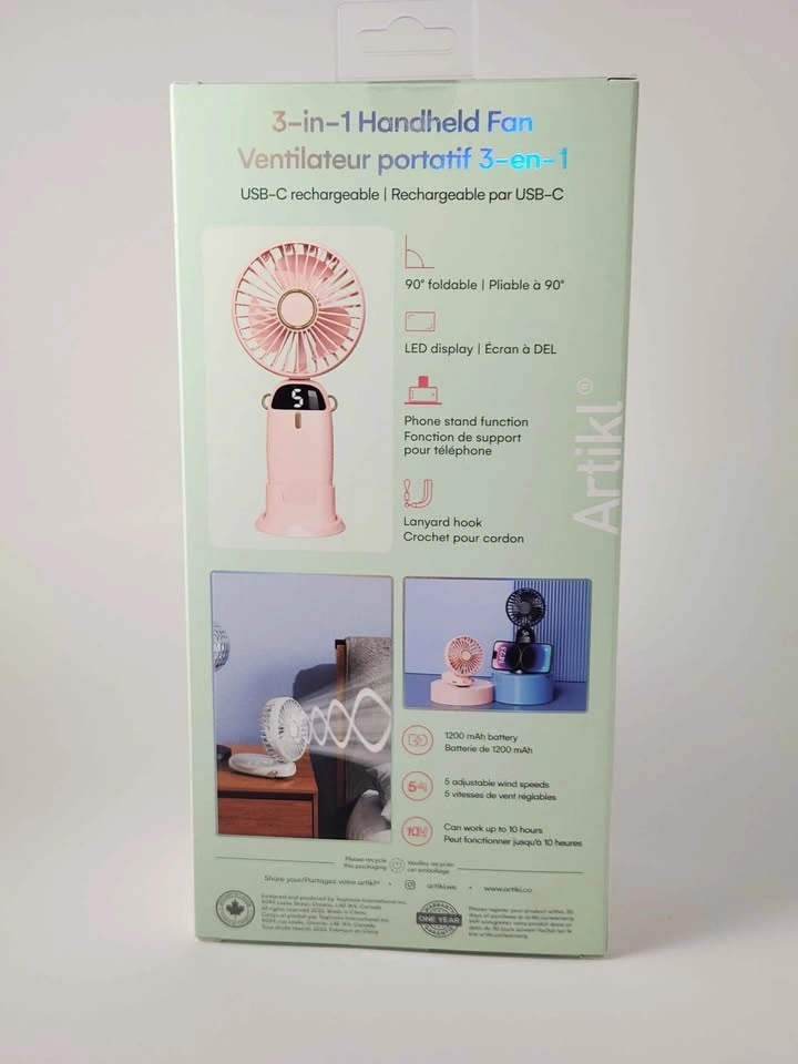 Stay cool anywhere with this versatile Artikl 3-in-1 Handheld Fan. It’s more than just a fan—it’s a portable cooling station perfect for travel, outdoor events, or your office desk.