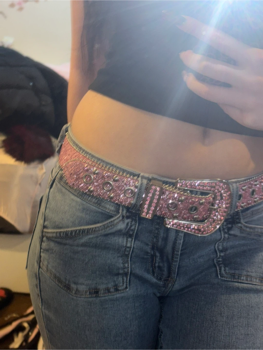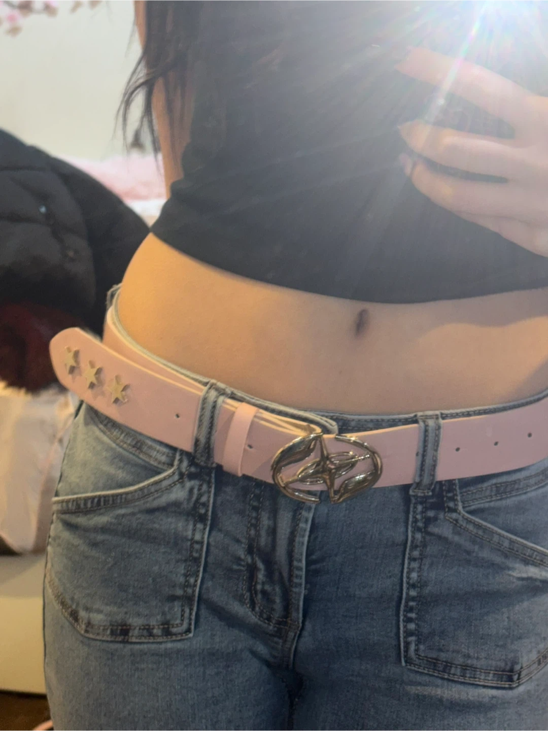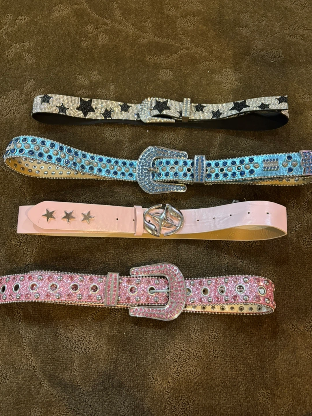 Selling a collection of stylish belts! Includes a pink rhinestone belt, a black star belt, a light blue rhinestone belt, and a pink belt with star accents. All are in great condition and ready to add some flair to your outfits