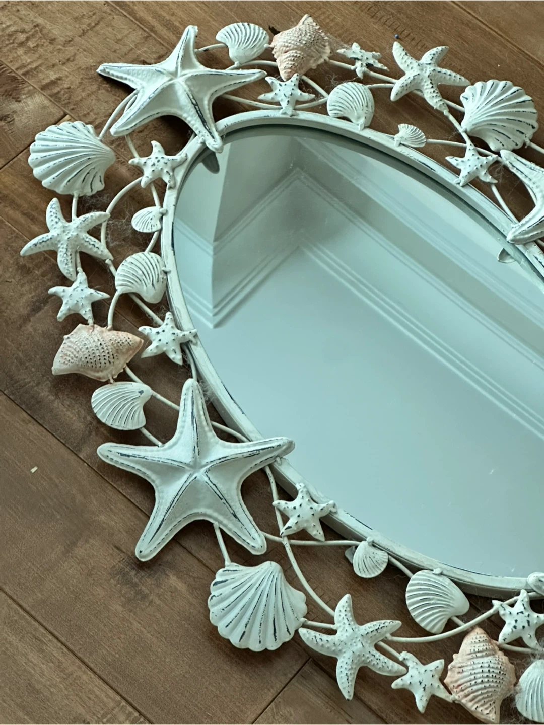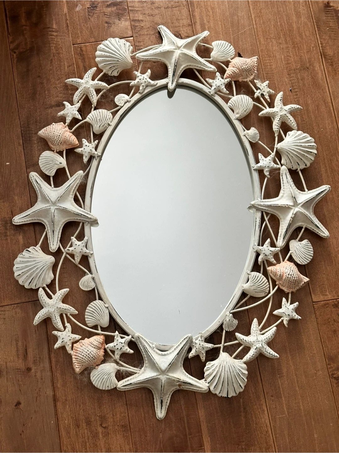 Oval wall mirror with a decorative frame made of seashells and starfish. It's painted white with some distressed accents. Adds a charming coastal touch to any room!