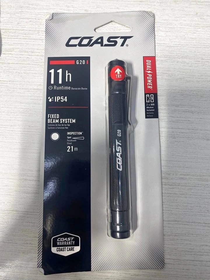 Brand new with box. Model: 20254. Retail Price: $27.71. Seller Price: $20. Pickup location: Islington and Rexdale, Etobicoke. Please call or message: [hidden information]. Only cash accepted. Whether you store it in your shirt pocket, pants pockets or a tool bag, the G20 Flashlight with its Inspection Beam Optic is a light that you should keep close. Optimized for up close use with its crisp edges and low glare, the perfectly circular beam illuminates where and when you need it. With Coast's commitment to quality, the G20 Flashlight is impact resistant, weather resistant and its LED is virtually unbreakable. The G20 Flashlight is backed by Coast's lifetime warranty against defects in materials and workmanship. Tested and rated to ANSI/FL1 standards.