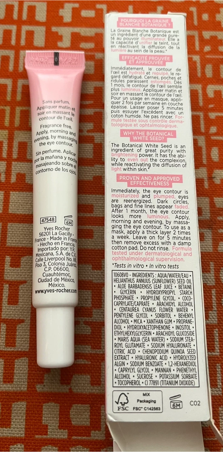 This Yves Rocher eye contour cream is fragrance-free. It's designed to brighten the eye area and comes in a 15ml tube. Apply morning and evening by massaging the eye contour.