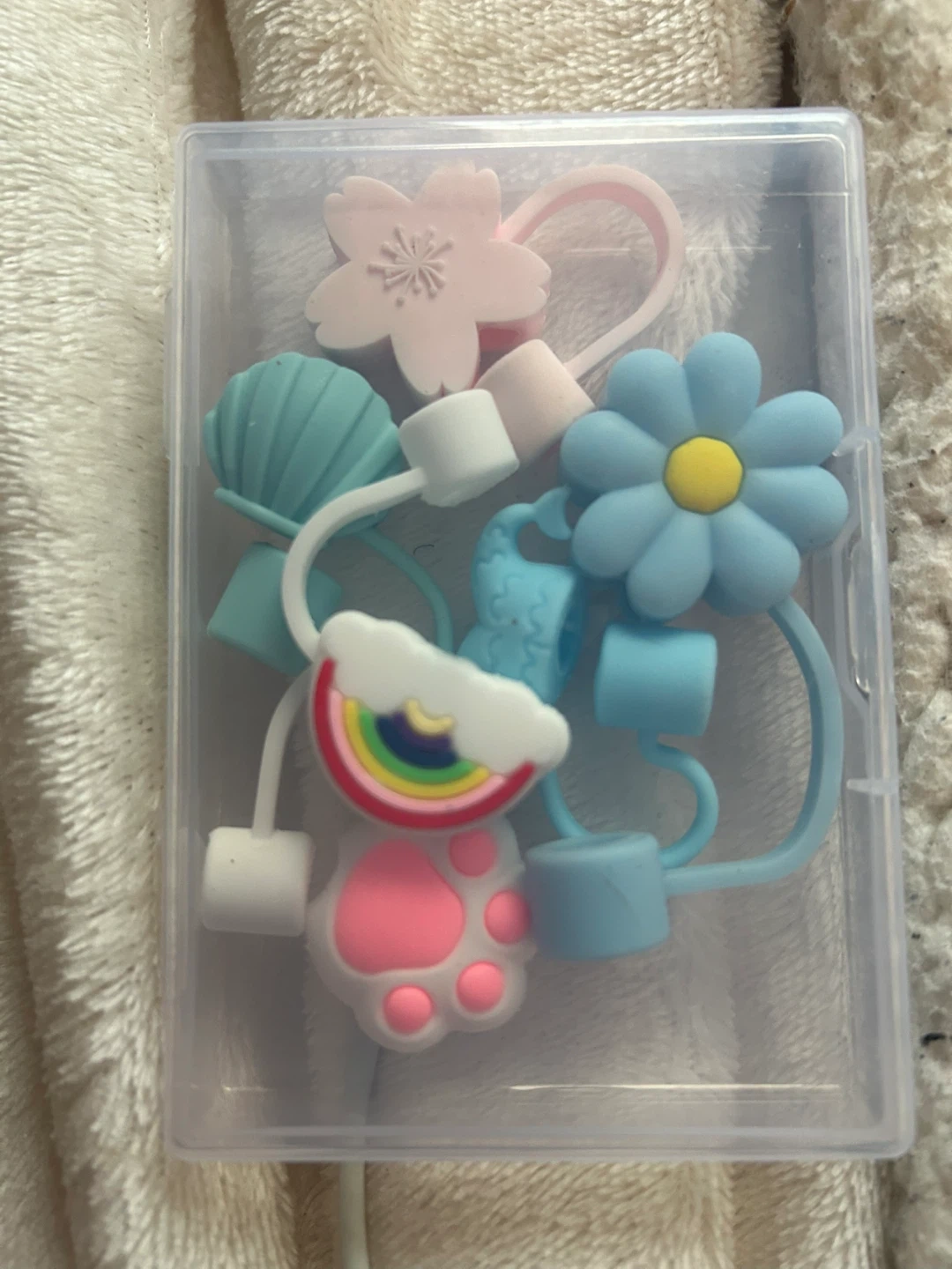 Selling a set of cute straw toppers! They come in a variety of fun shapes, including a flower, seashell, rainbow, and paw print. They're perfect for adding a bit of fun to your drinks, and they come in a handy case for easy storage