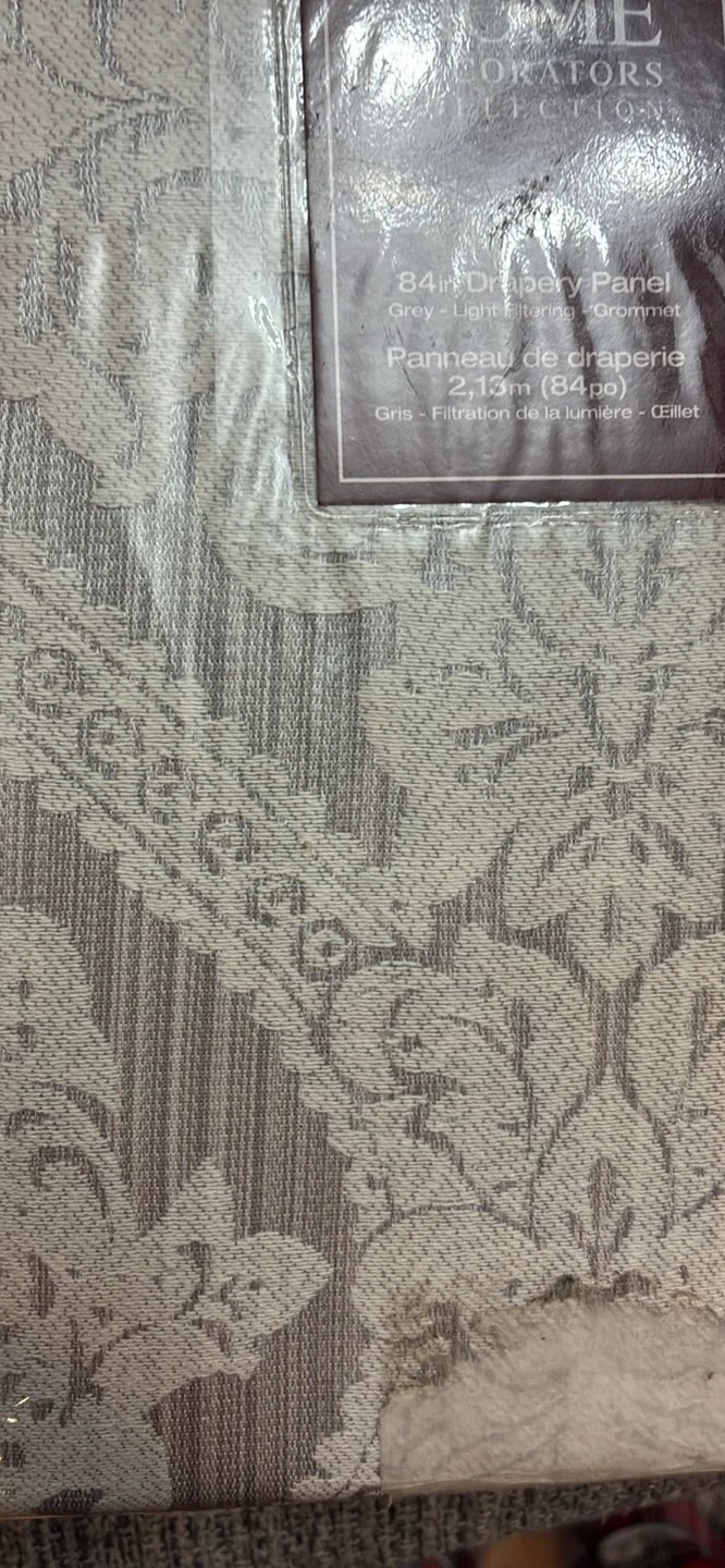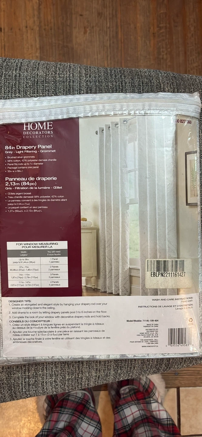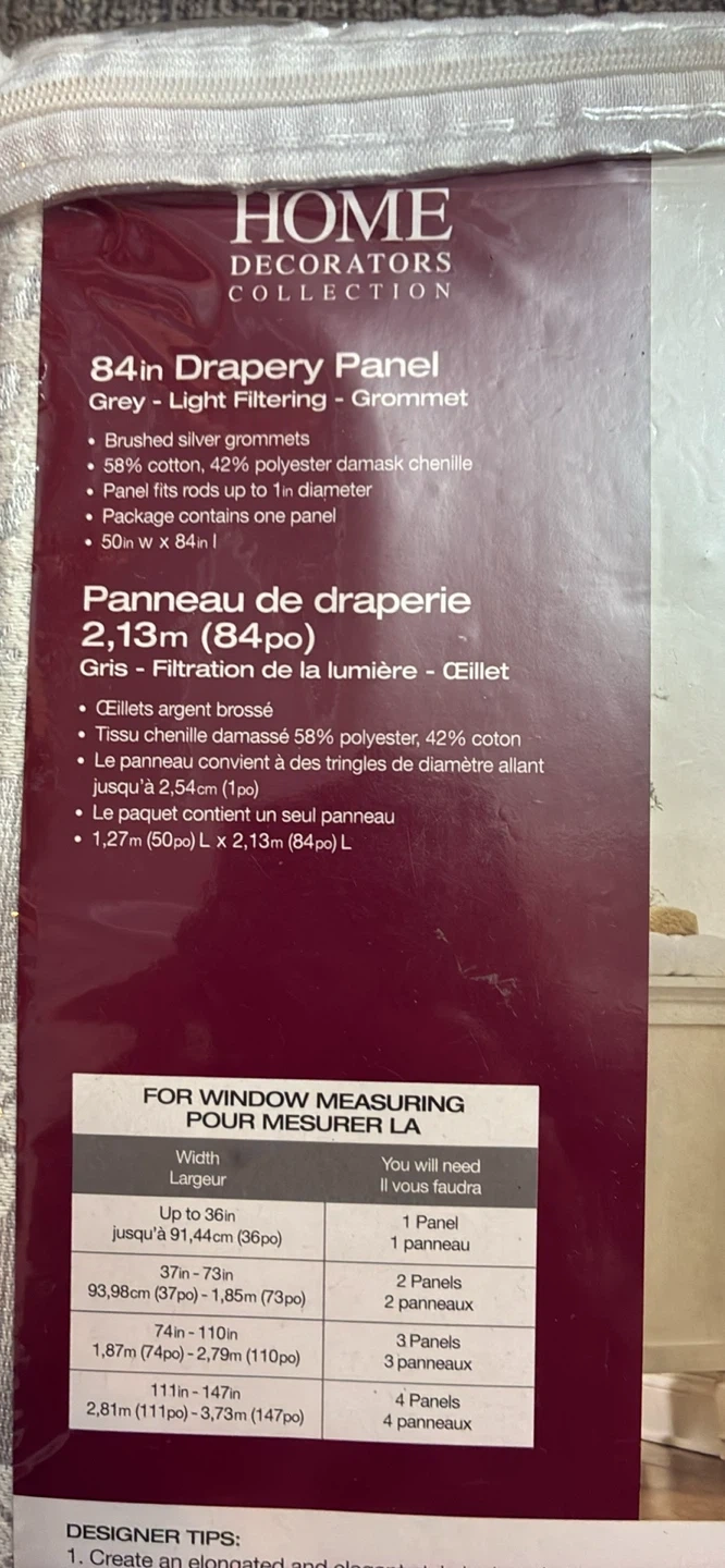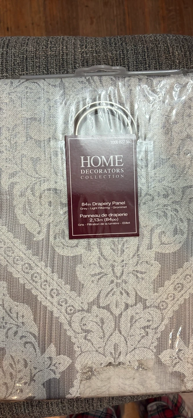 Selling a new Home Decorators Collection 84-inch drapery panel in grey. It's light filtering and has a grommet top.