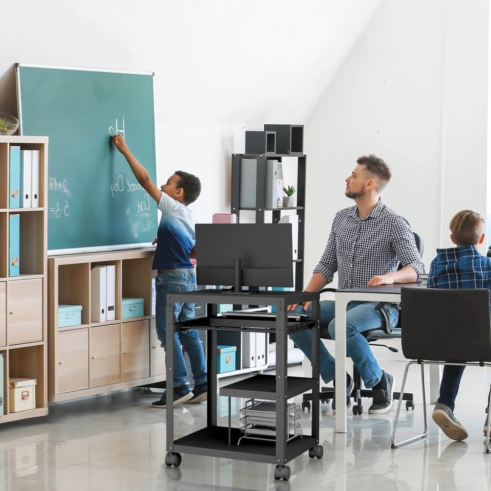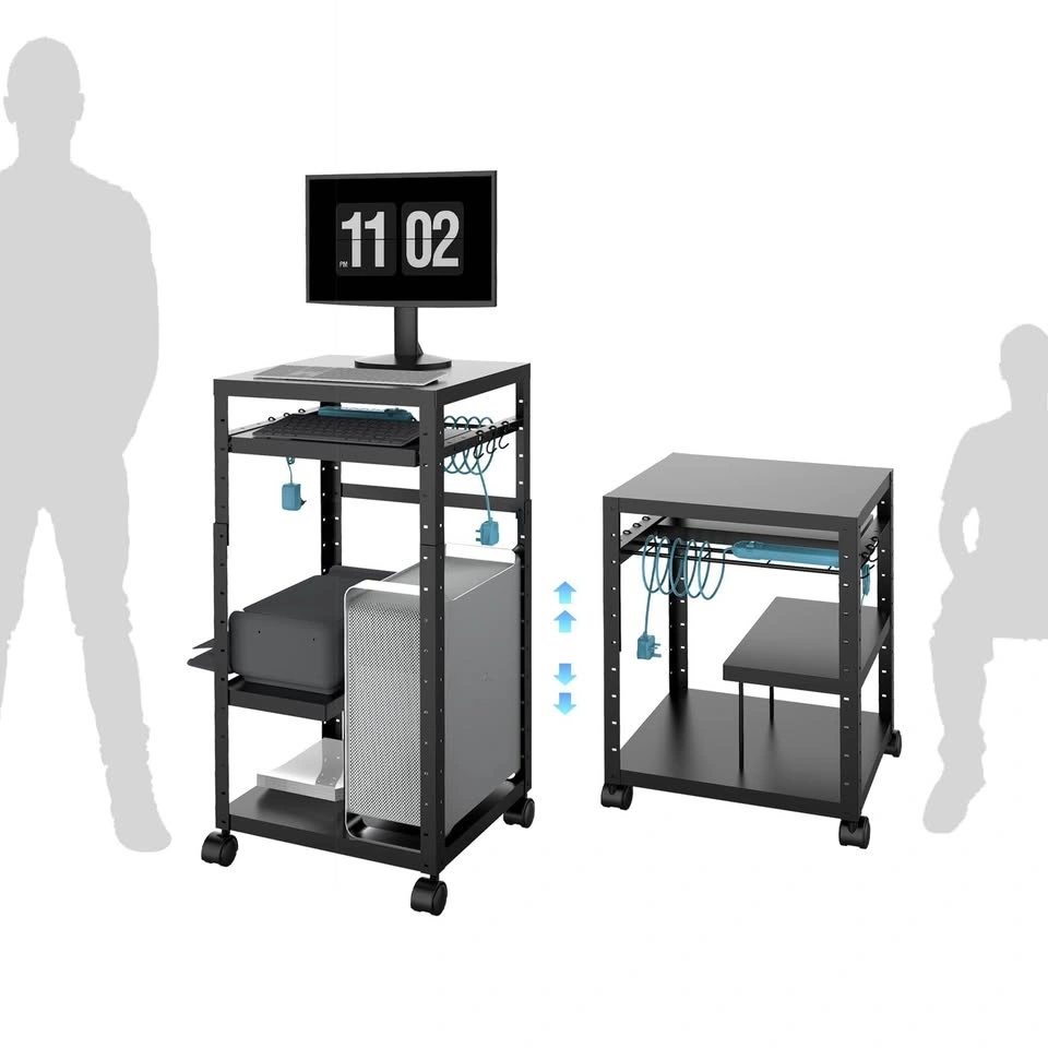 Space Efficient: Four solid platforms (top monitor shelf, slightly lower keyboard shelf also with hooks, middle shelf and base shelf for pc tower, printer, speakers, etc.) make this mobile desk perfect for smaller work Spaces such as offices, classrooms, etc