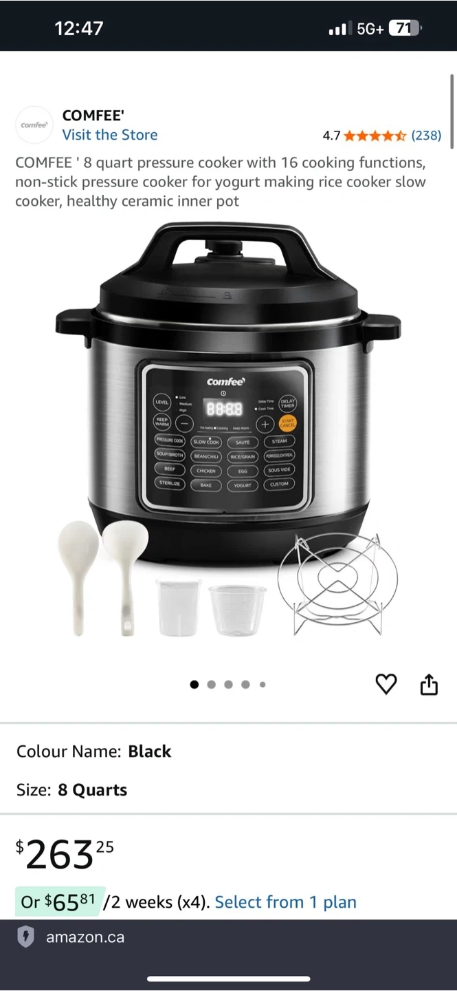 Selling a Comfee' 8 quart electric pressure cooker in black. It has 16 cooking functions, including pressure cooking, slow cooking, yogurt making, and rice cooking. The inner pot is a healthy ceramic non-stick. Originally bought for $263.25. Comes with the box