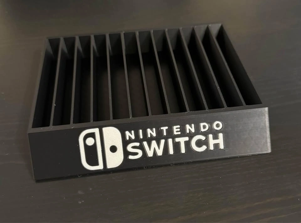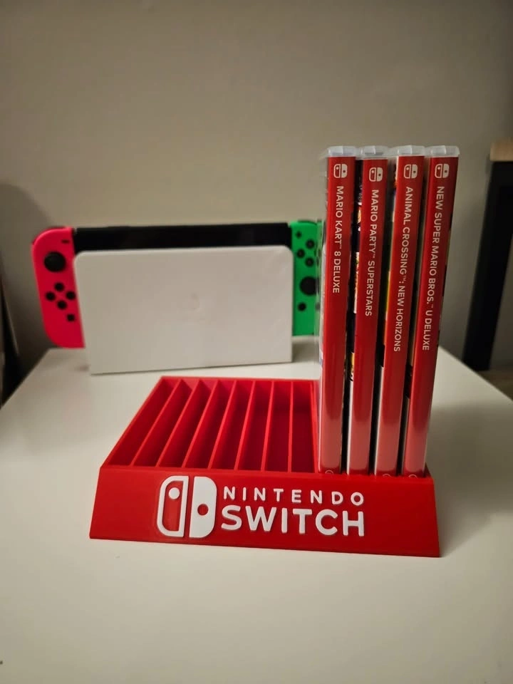 Custom 3D printed stand organizer for up to 12 Nintendo Switch games. Additional colors available for logo, text, and stand. Please message for inquiries.