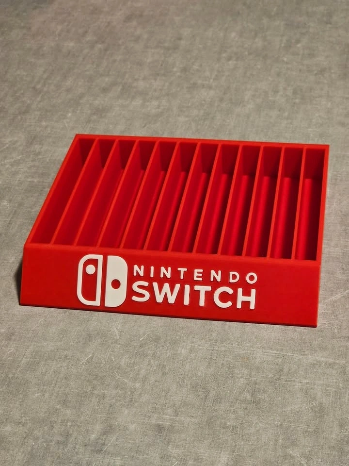 Custom 3D printed stand organizer for up to 12 Nintendo Switch games. Additional colors available for logo, text, and stand. Please message for inquiries.