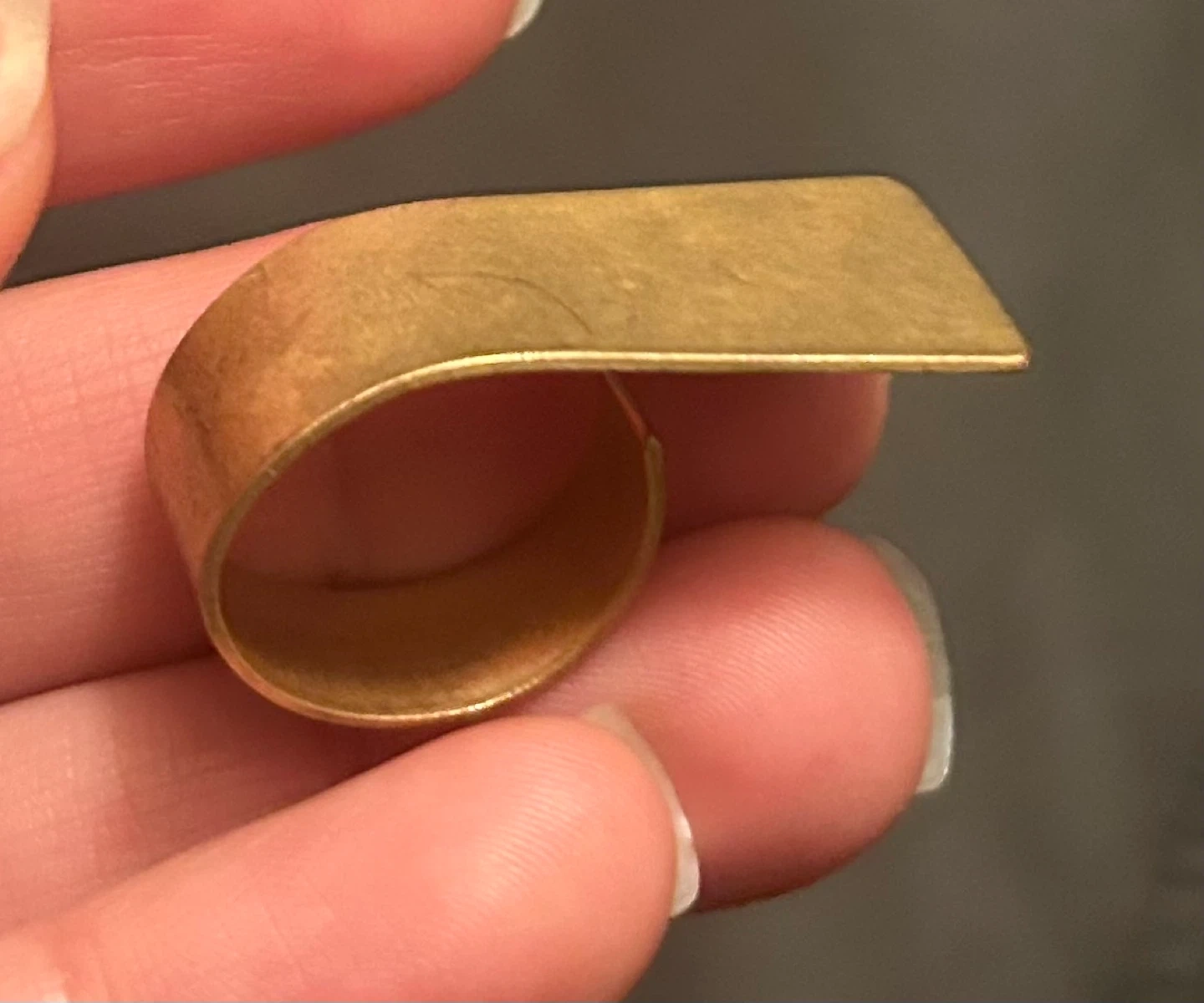 This abstract ring has a unique gold tone finish. It's made of metal. This piece would make a great addition to any jewellery collection!