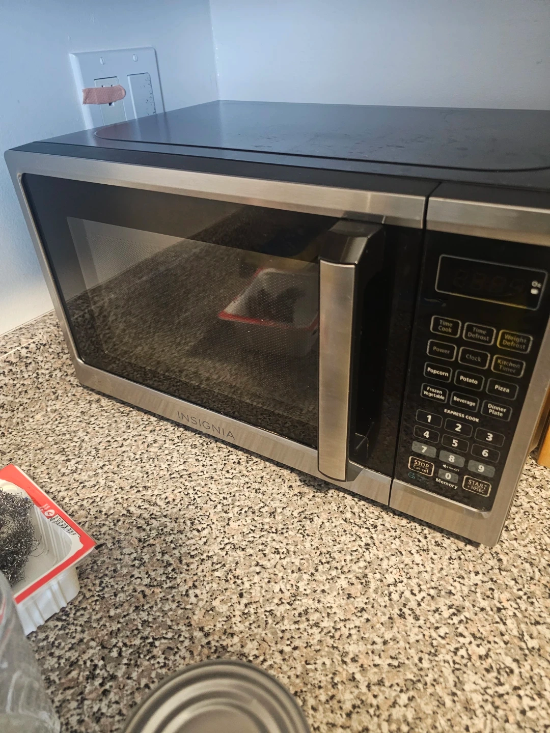 Insignia microwave with express cook buttons for popcorn, potato, pizza, and more. It's a countertop appliance with a digital display and various cooking functions. Perfect for quickly heating up meals or snacks!