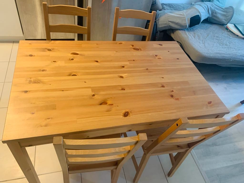 Wooden dining table and four chairs. The table and chairs are a light, natural wood tone.