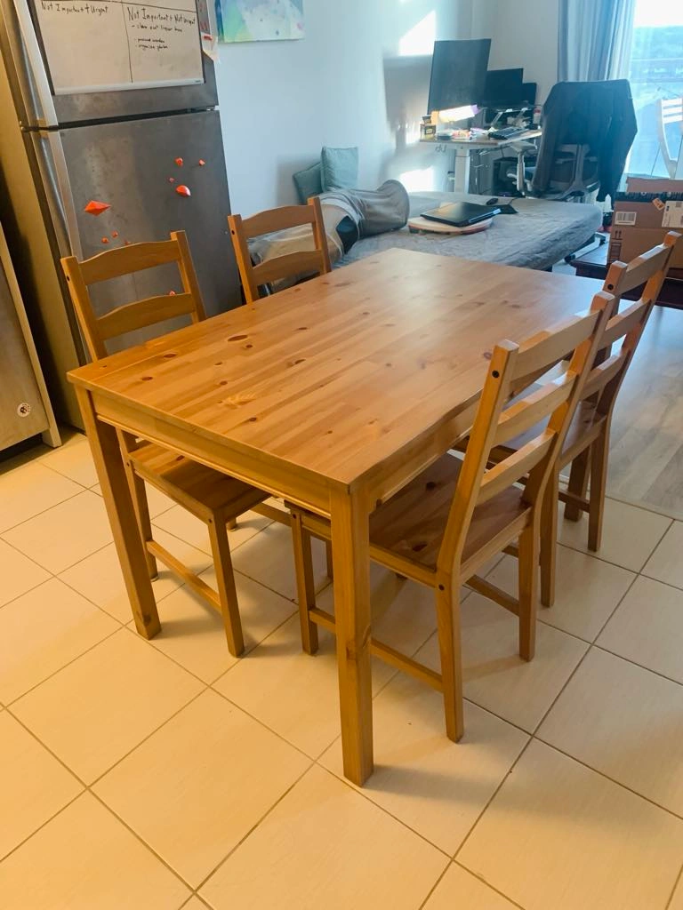 From Ikea: https://www.ikea.com/ca/en/p/jokkmokk-table-and-4-chairs-antique-stain-50211104/