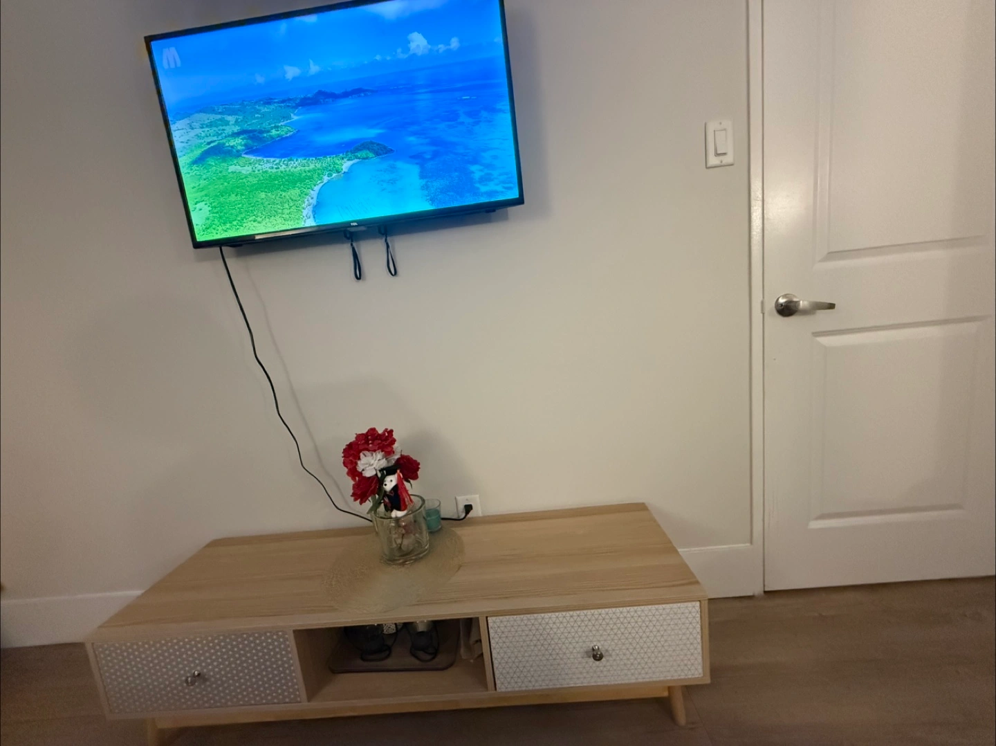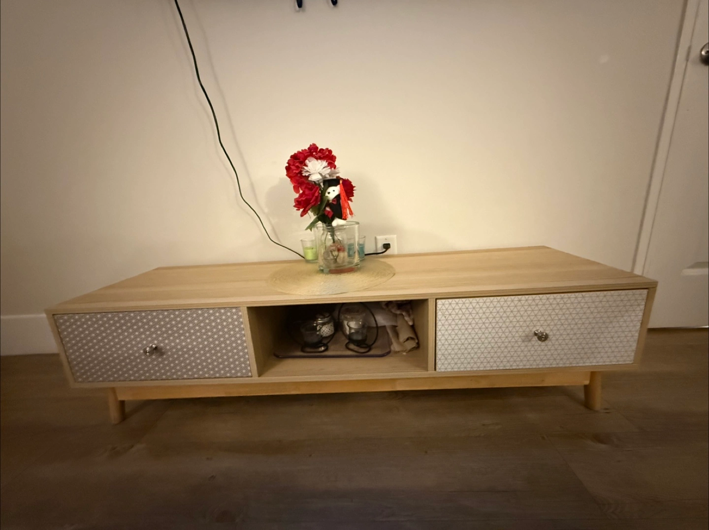 Selling a cute wooden TV stand! It has two drawers with patterned fronts and an open shelf in the middle. Perfect for adding a touch of style to your living room or entertainment area