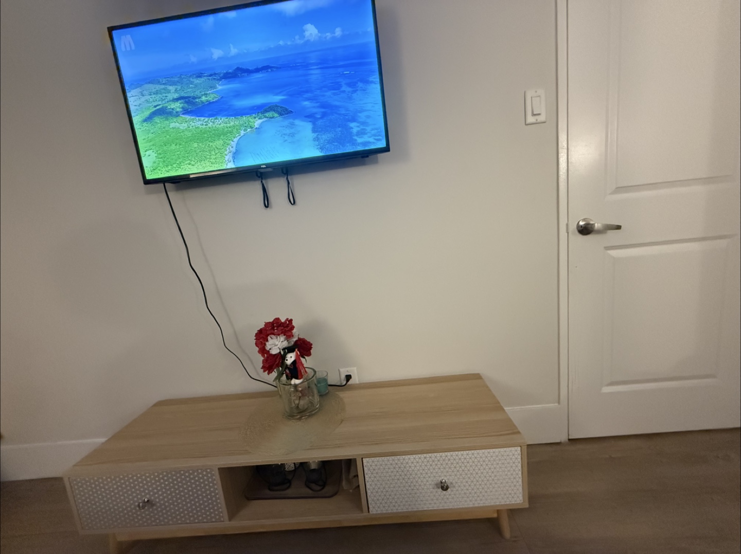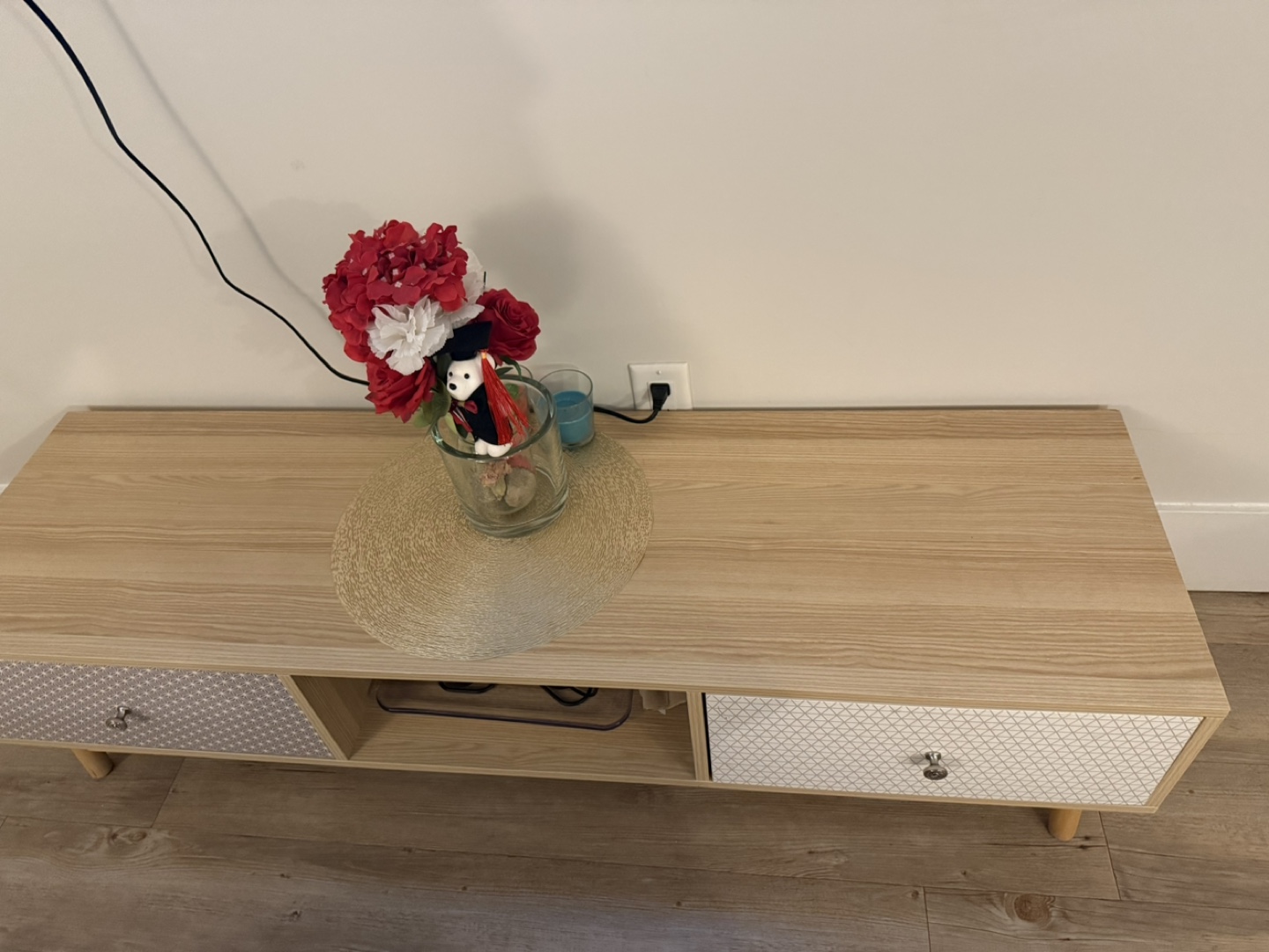 Selling a cute wooden TV stand! It has two drawers with patterned fronts and an open shelf in the middle. Perfect for adding a touch of style to your living room or entertainment area