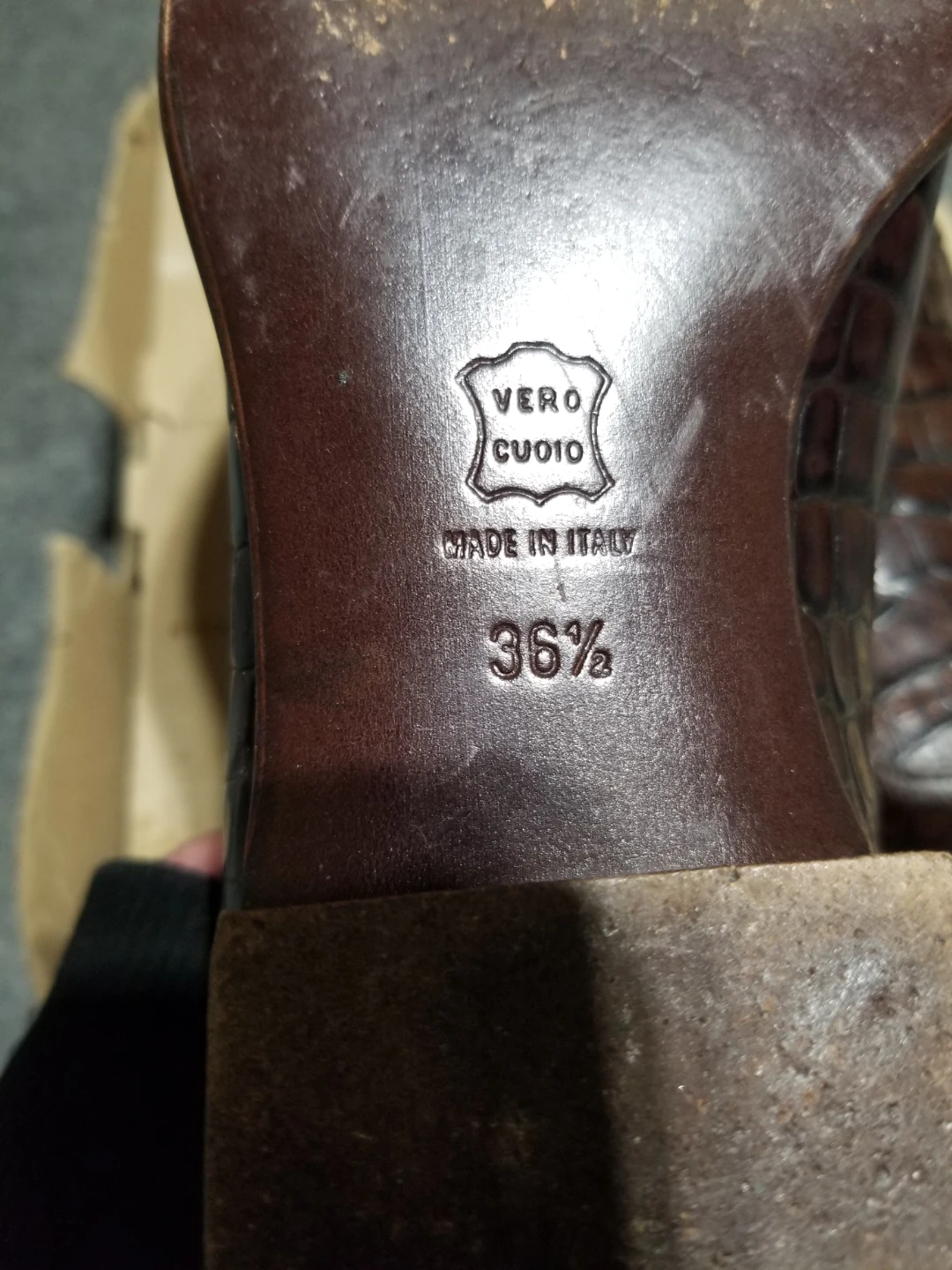 Selling a pair of women's Emporio Armani shoes in a beautiful and unique brown crocodile leather. They are marked as a size 6. The soles are marked as 'Vero Cuoio' and 'Made in Italy'. They've only been worn a handful of times but do not show it. Pick up only please