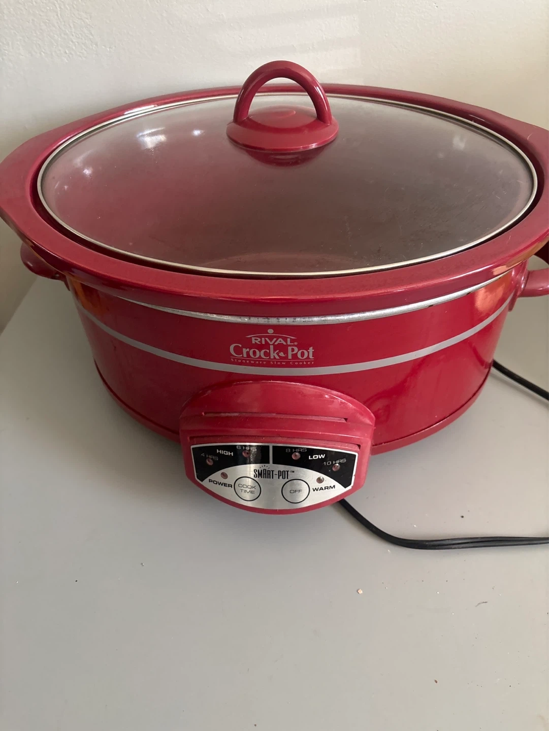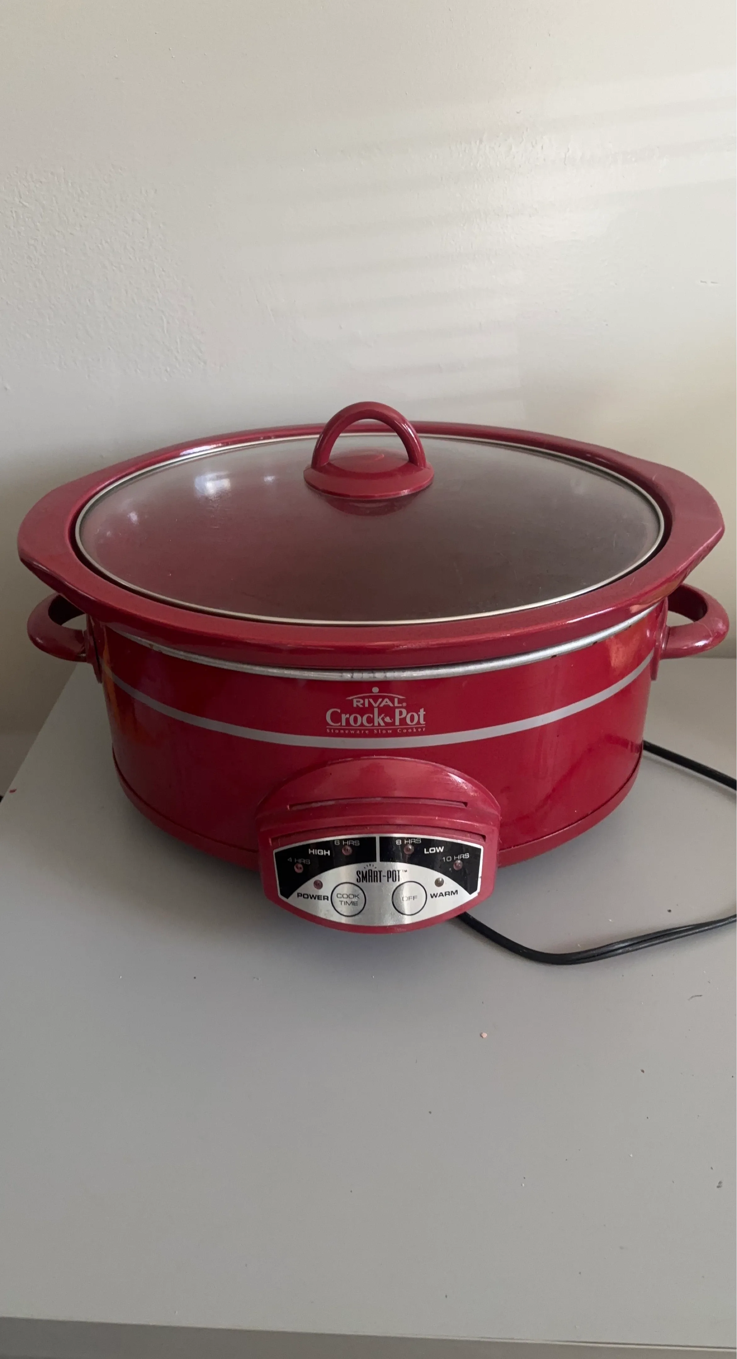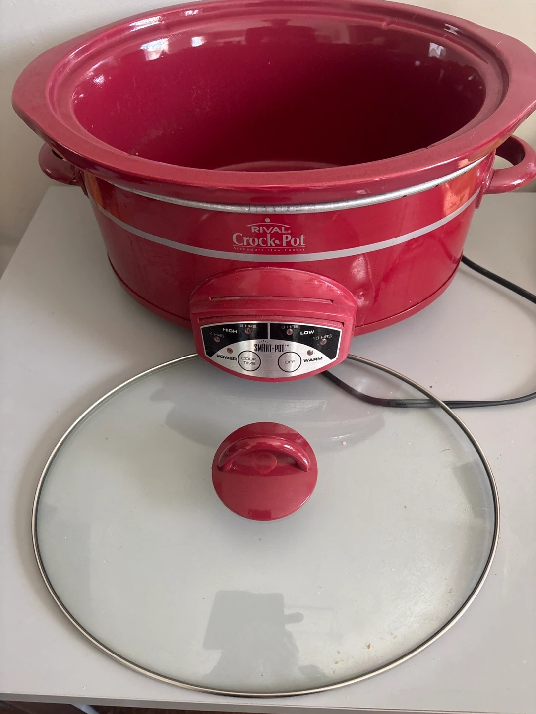 This red Rival Crock-Pot slow cooker has three settings: High, Low, and Warm. It's great for preparing meals with minimal effort. A glass lid is included for easy viewing.