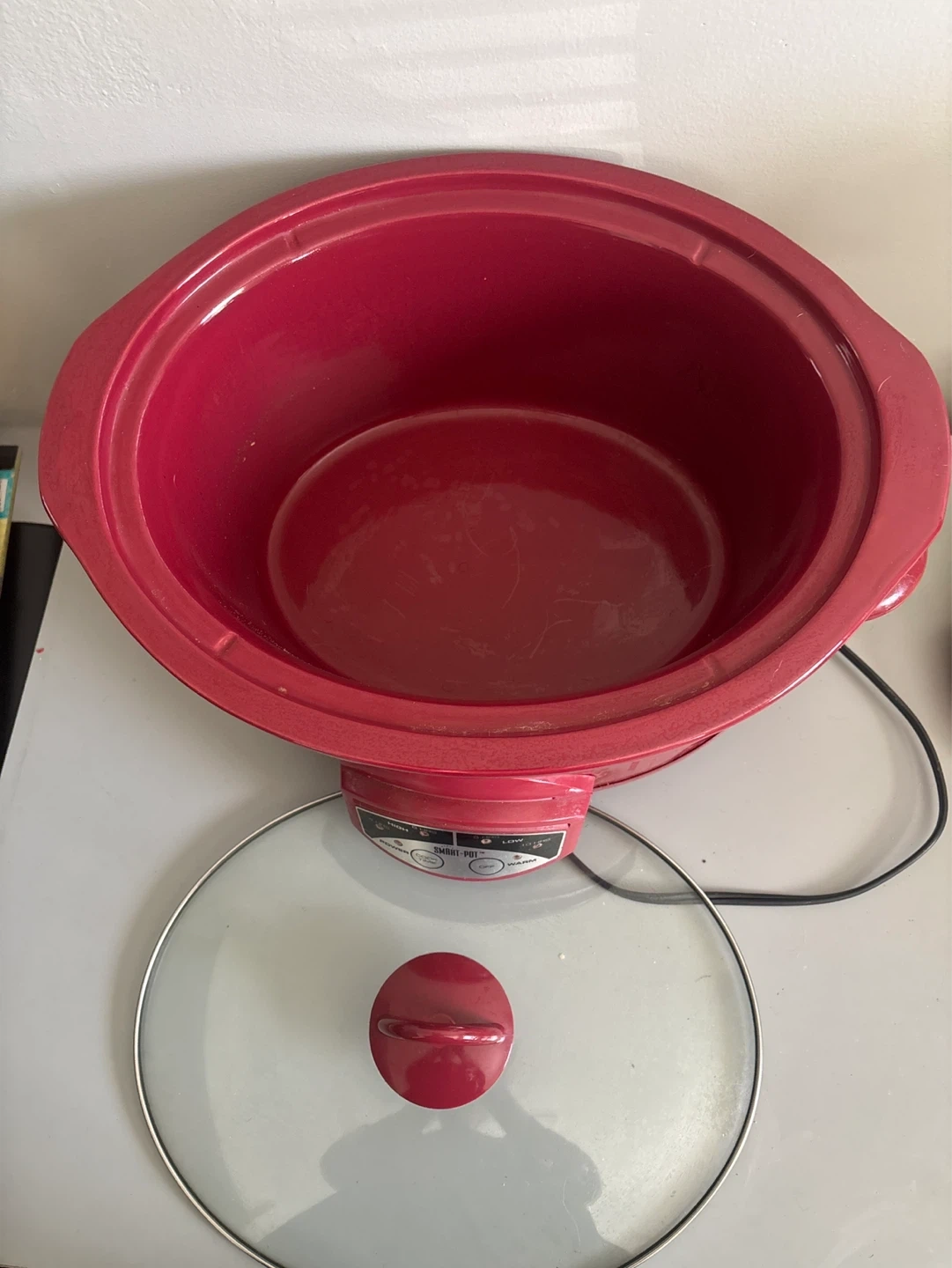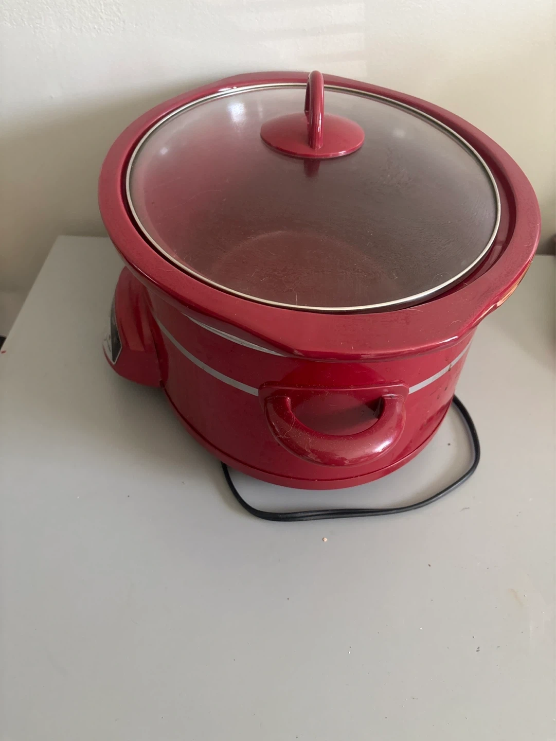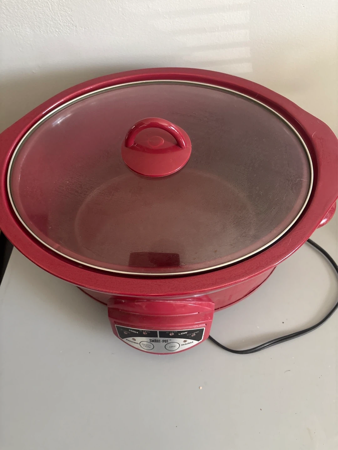 This red Rival Crock-Pot slow cooker has three settings: High, Low, and Warm. It's great for preparing meals with minimal effort. A glass lid is included for easy viewing.