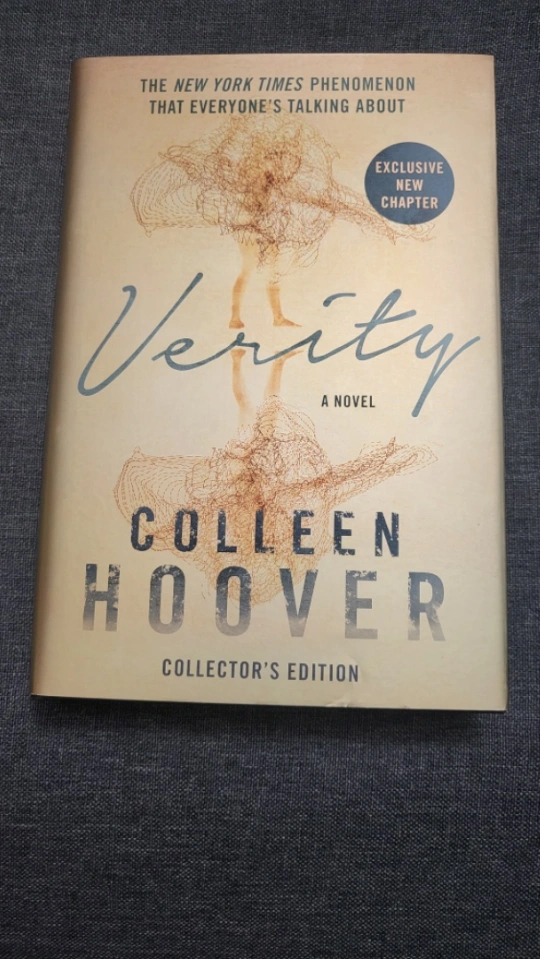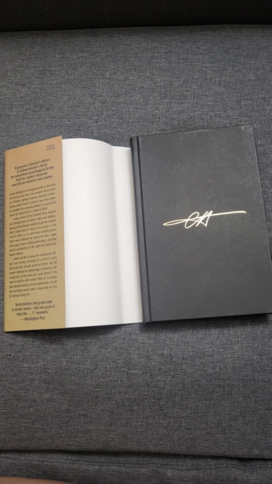 A hardcover novel. The book cover has a black background with gold lettering and an image on the front. It has an exclusive new chapter.
