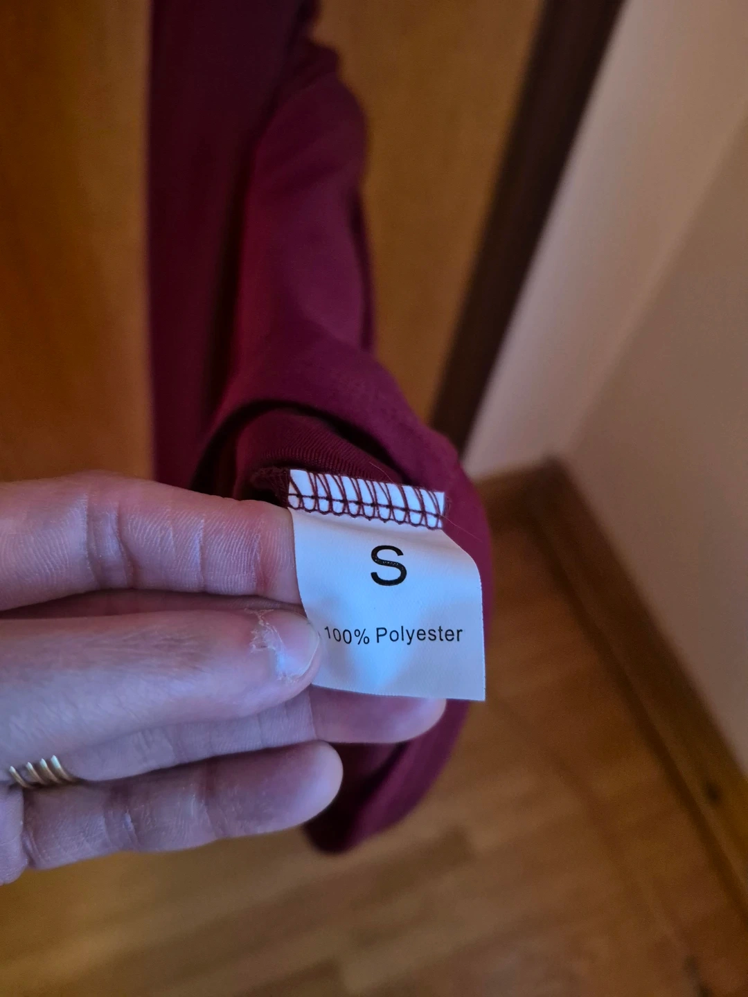 Selling a lovely burgundy dress. It's a size small and made of 100% polyester. The dress features a decorative brooch detail at the neckline.
