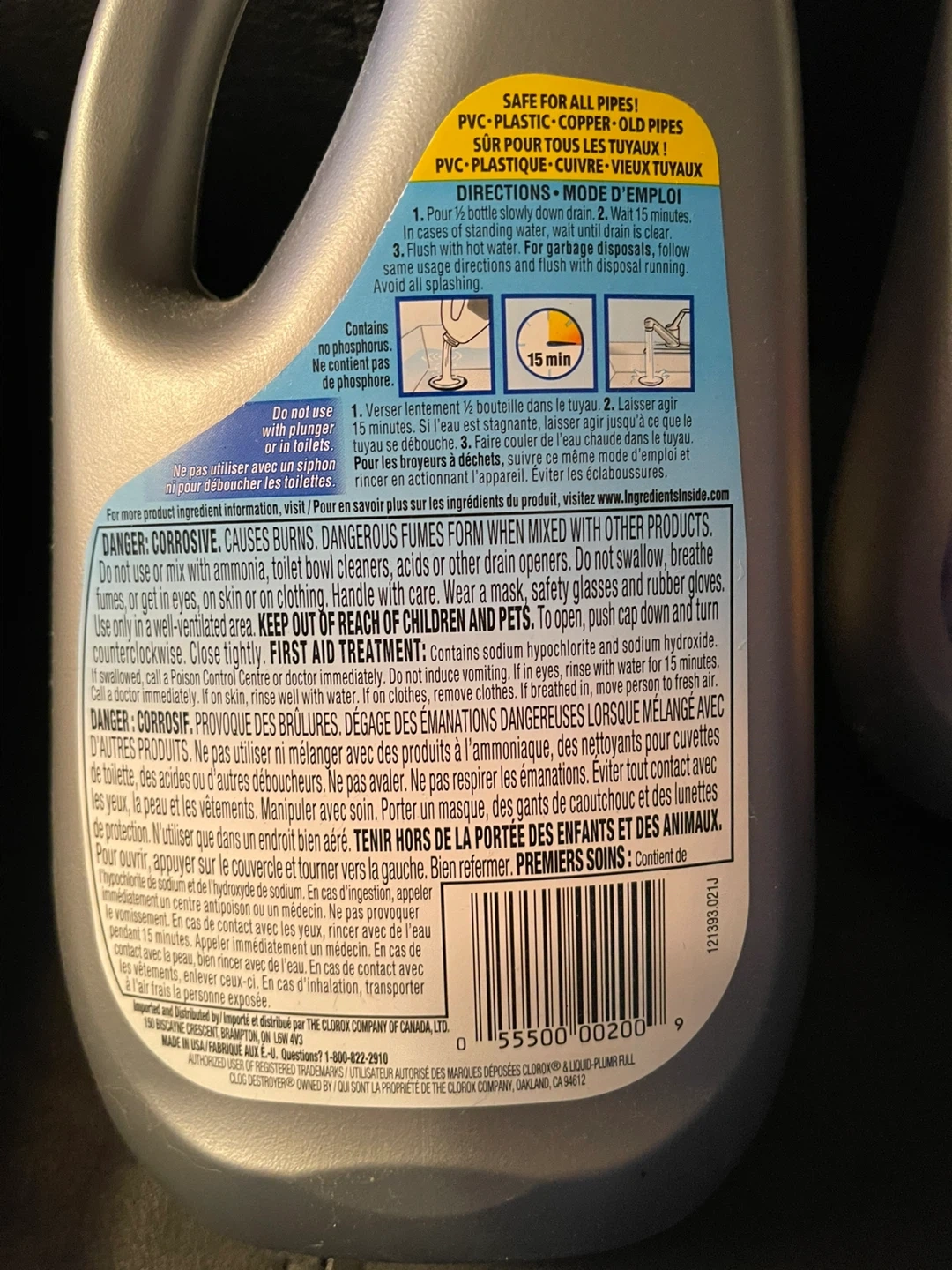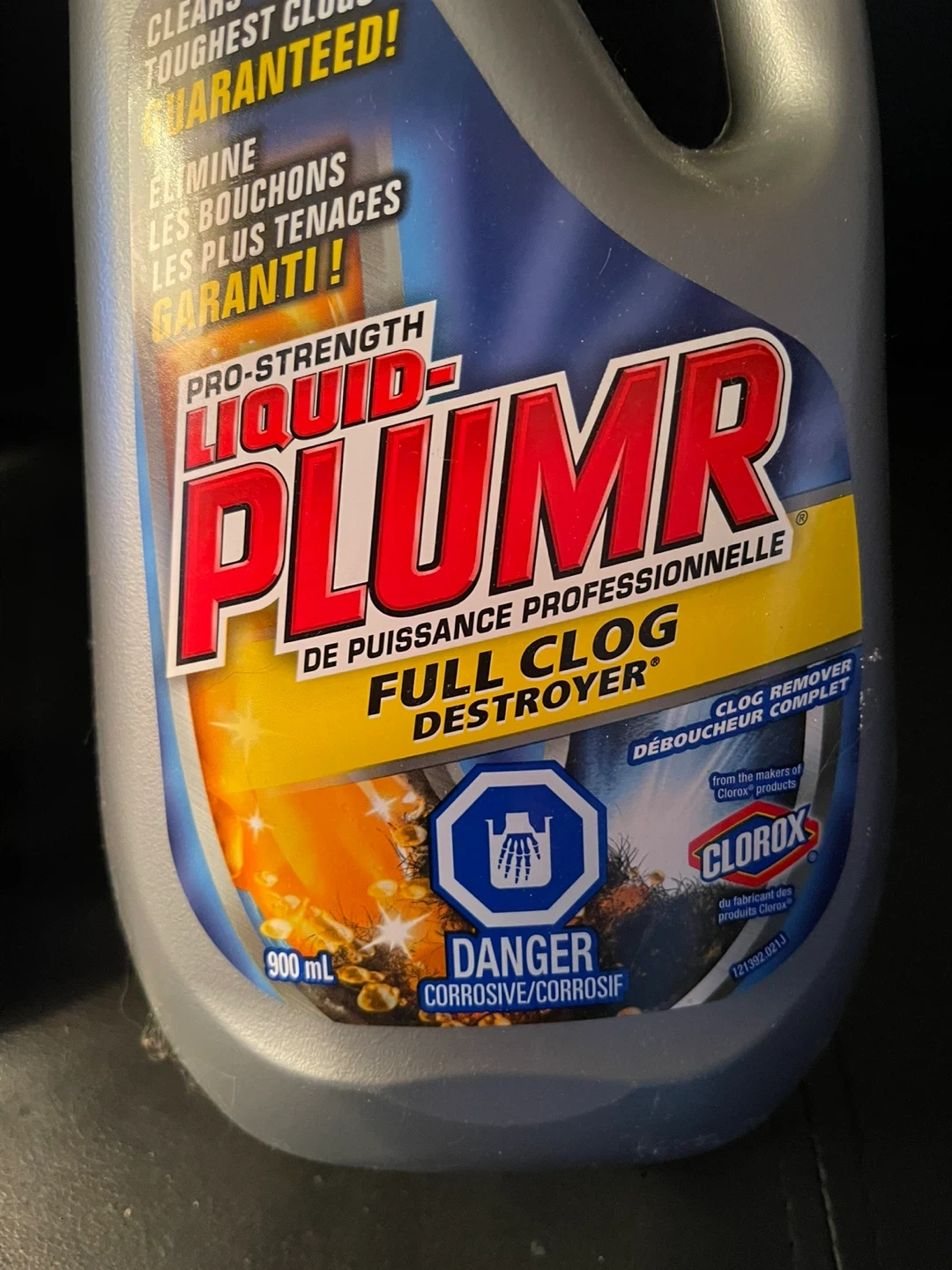 Pro-strength Liquid-Plumr Full Clog Destroyer. Clears the toughest clogs guaranteed! One bottle is brand new and contains 900 ml. The other bottle is half full. Each treatment requires half a bottle so this amounts to three treatments. Use for disposal and drain clogs.