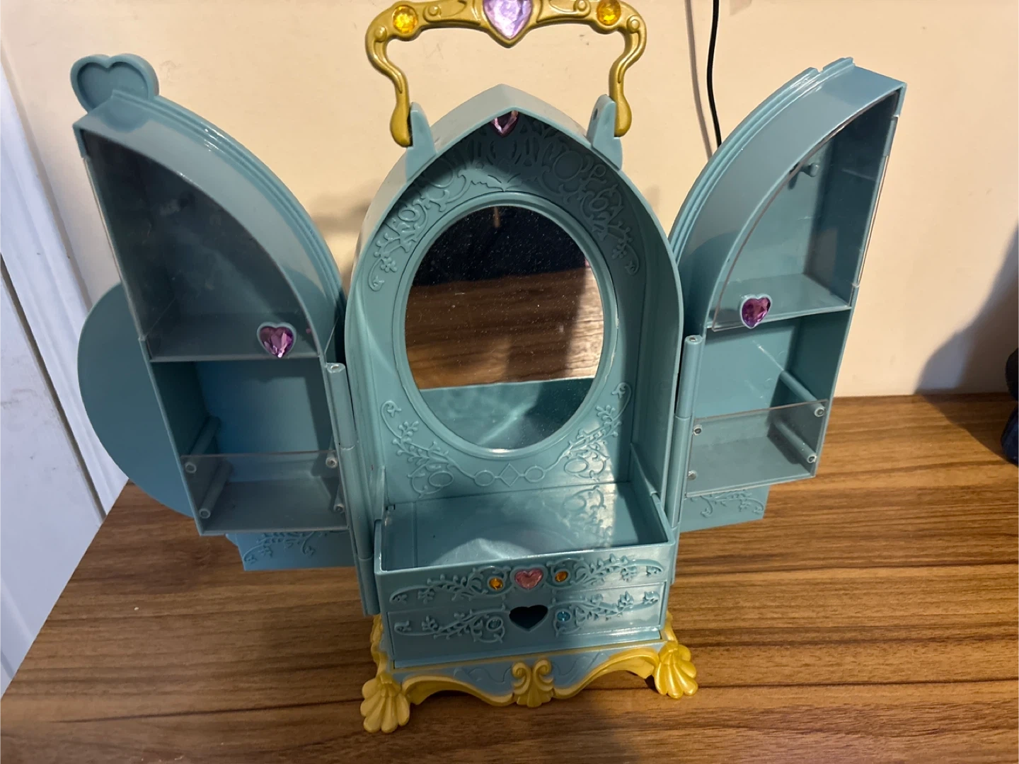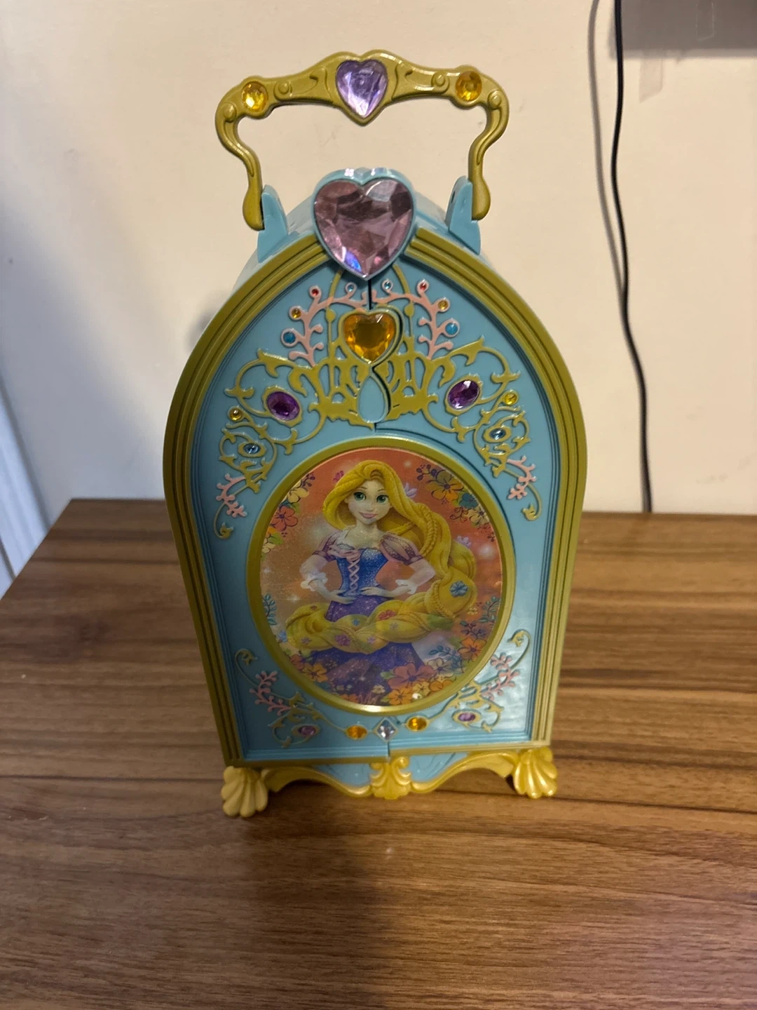 This Disney Princess jewelry box features Rapunzel. It opens up to reveal compartments and a mirror inside. It's perfect for storing small treasures and accessories!