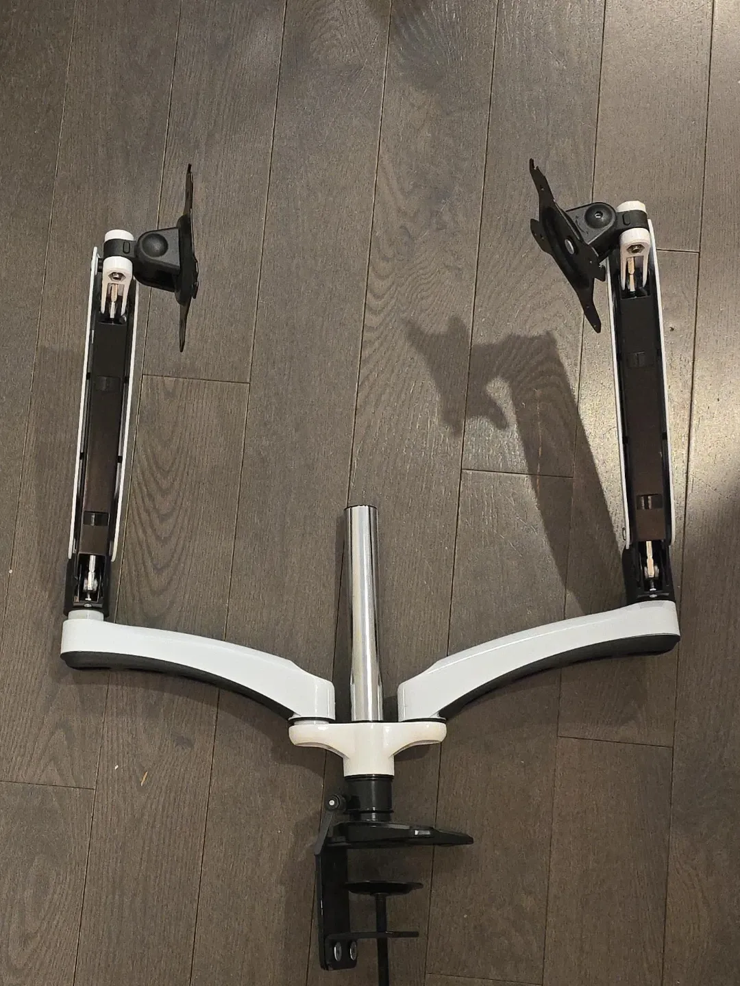 This is a white and black dual monitor desk mount stand with a clamp base. It's designed to hold two monitors, allowing for adjustable positioning. The clamp attaches to the edge of a desk for stability. Metal and plastic construction.