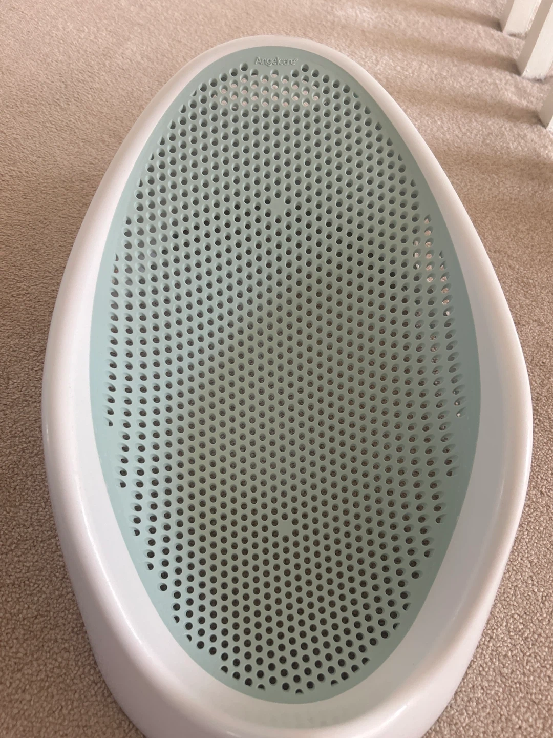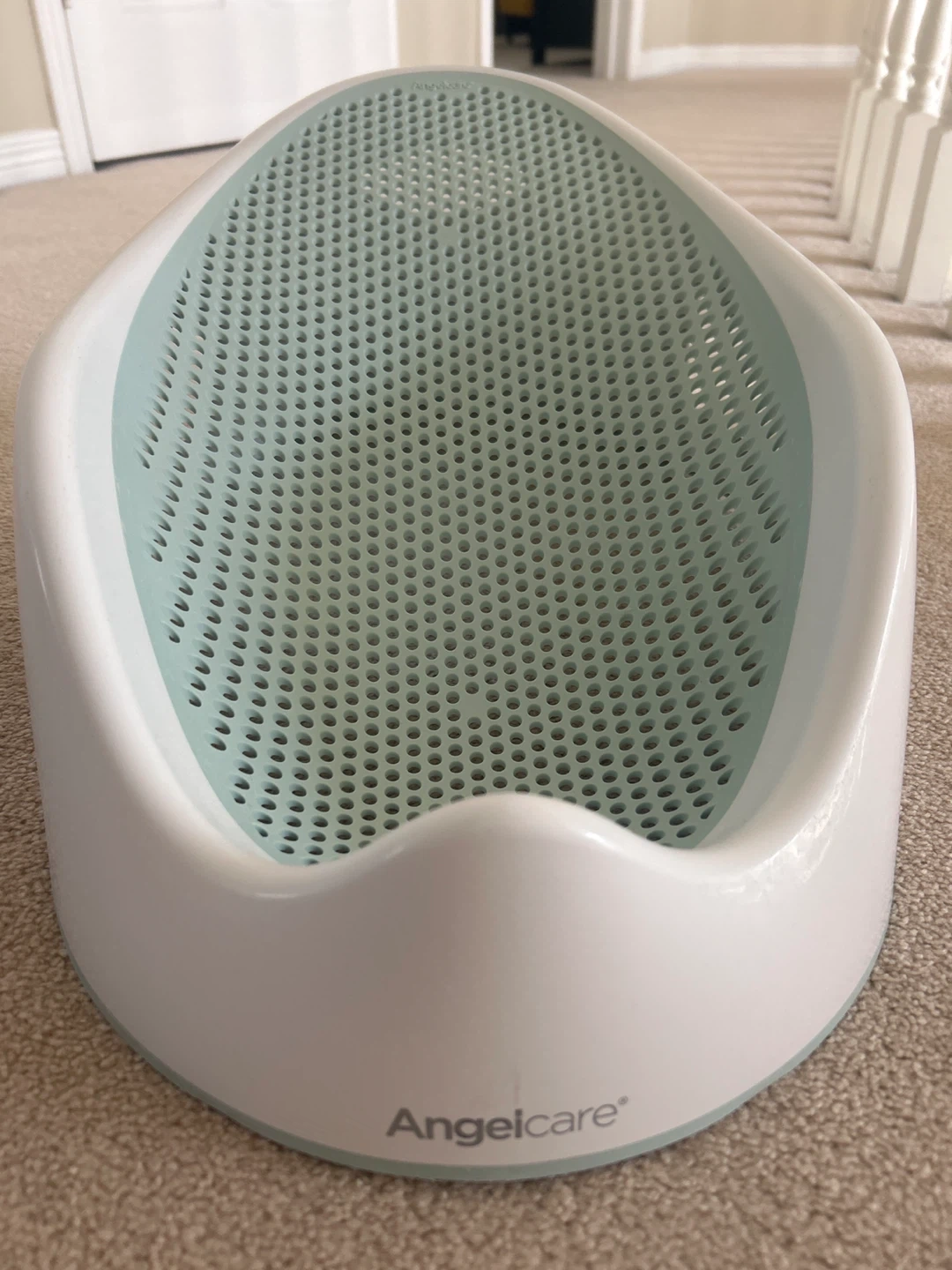 Angelcare baby bath support seat in white and light blue. It's made from durable plastic with a non-slip surface and drainage holes. Designed for use in the tub to help keep baby secure during bath time.