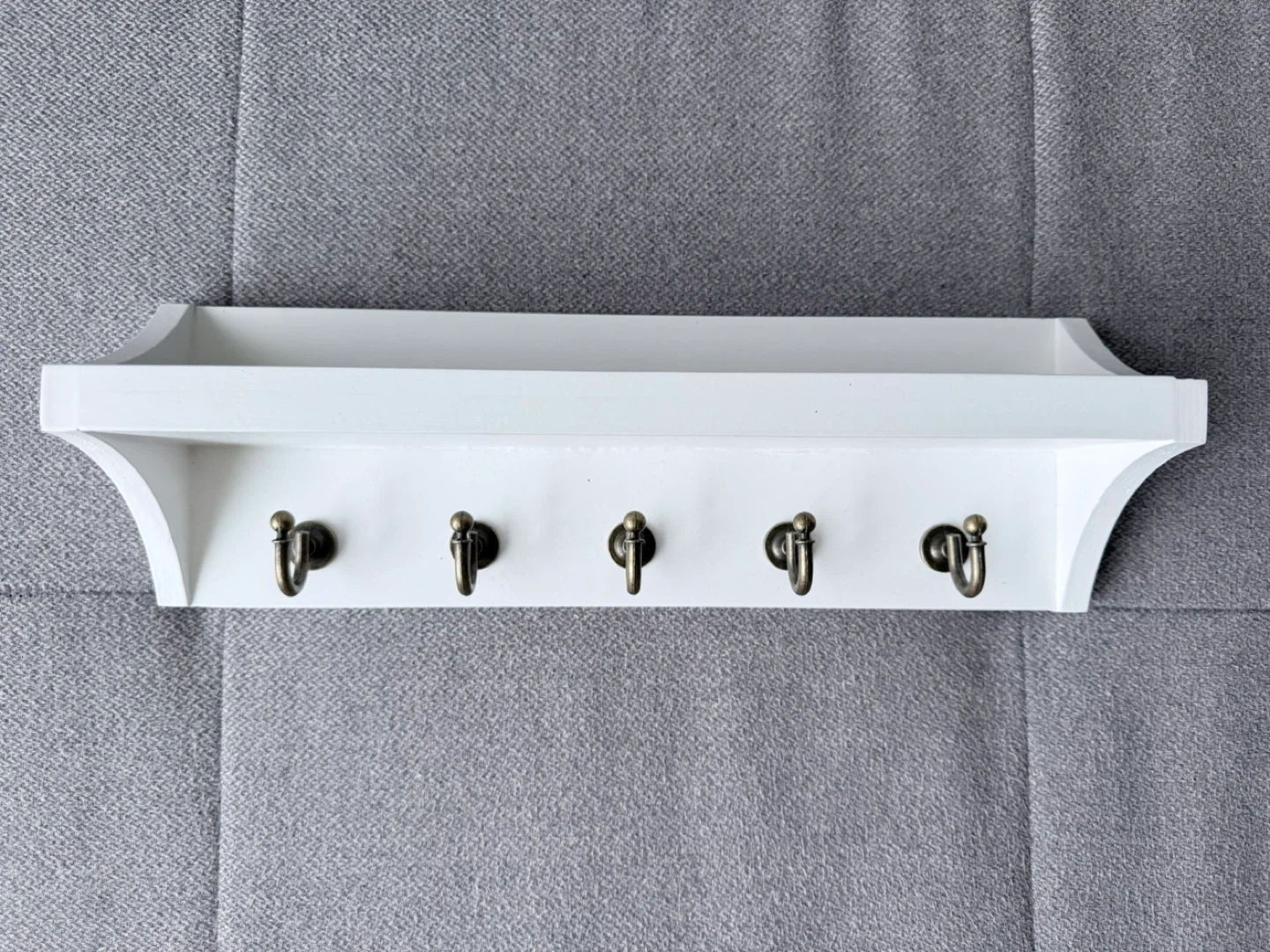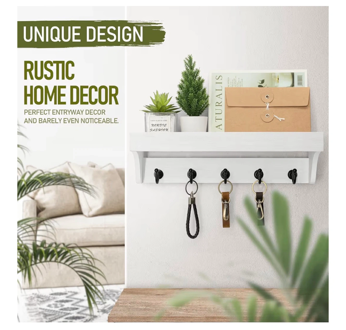• IVERSATILE WALL ORGANIZER] This sturdy and stylish whitewash key organizer wall mount features versatile hooks that enhance the functionality of your key and mail holder with shelf. With 5 decorative key hooks on a whitewash key hanger, it's perfect for holding dog leashes, purses, jackets, and more!