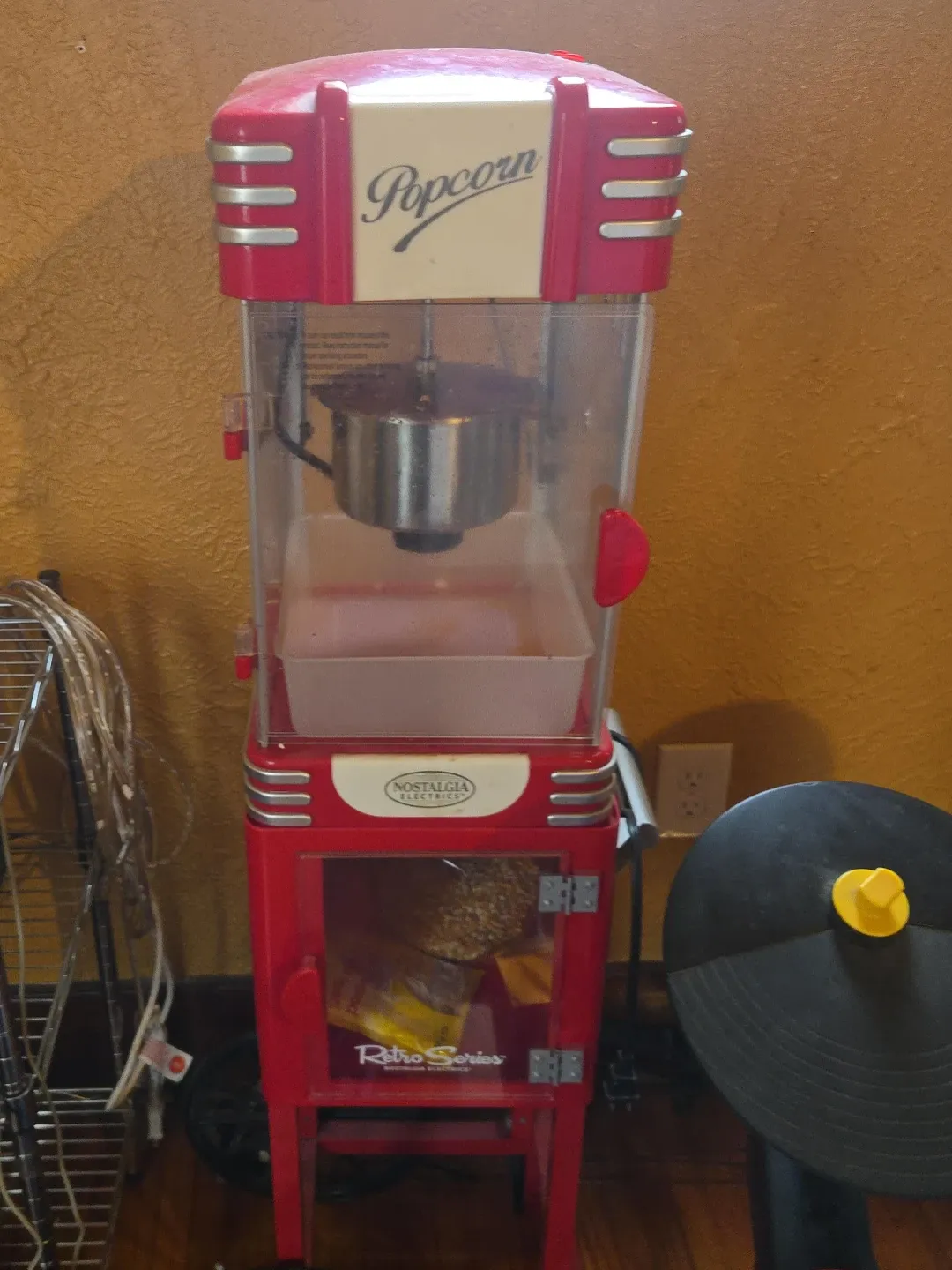 This Nostalgia electric popcorn machine features a retro design. It's perfect for making fresh popcorn at home! The kettle and interior are made of metal and plastic.