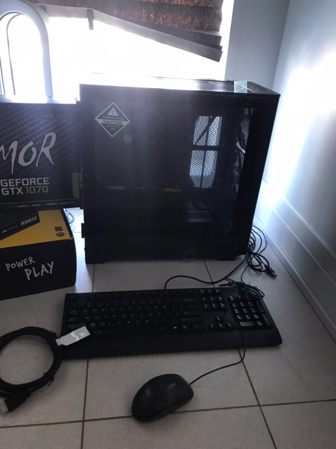 This bundle includes a gaming PC, keyboard, and mouse. The PC tower features an NVIDIA GeForce GTX 1070 graphics card. It's ready for gaming and general use!