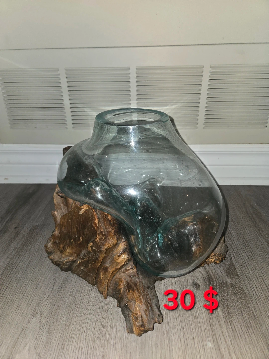 This unique decorative piece features a blown glass vase cradled by a natural driftwood base. It's a striking accent for any home decor. The clear glass showcases the organic texture of the wood.