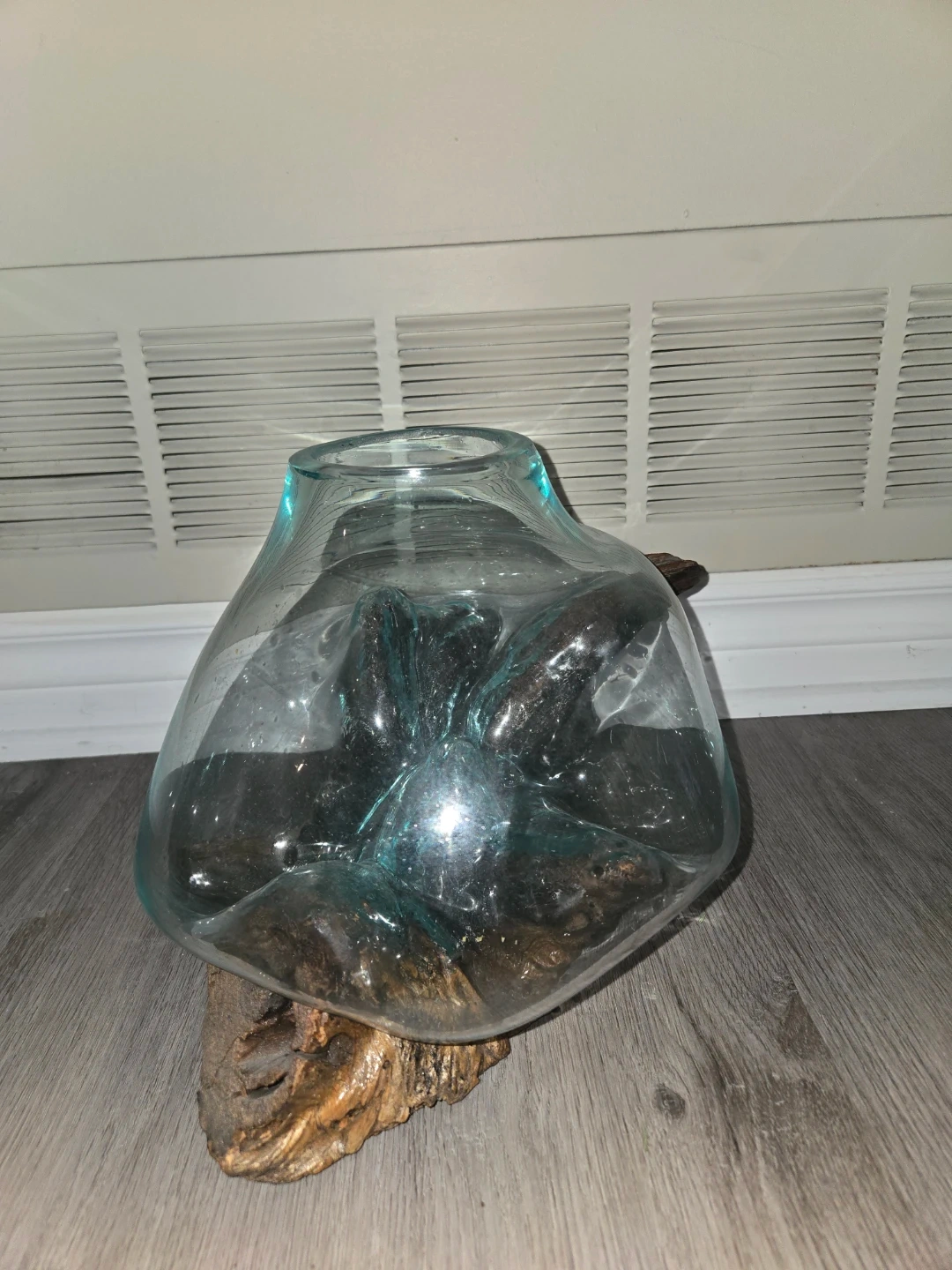 This unique decorative piece features a blown glass vase cradled by a natural driftwood base. It's a striking accent for any home decor. The clear glass showcases the organic texture of the wood.