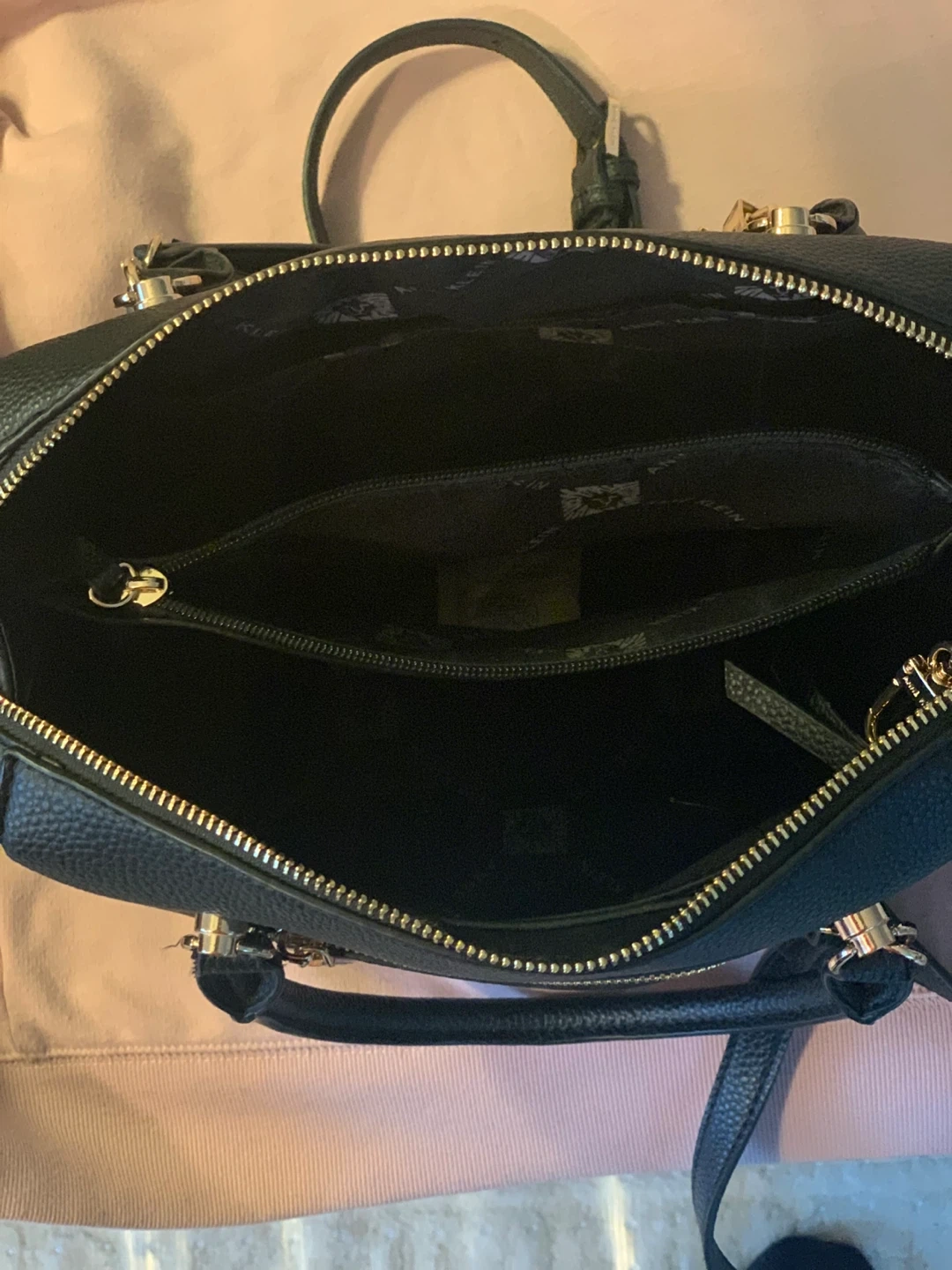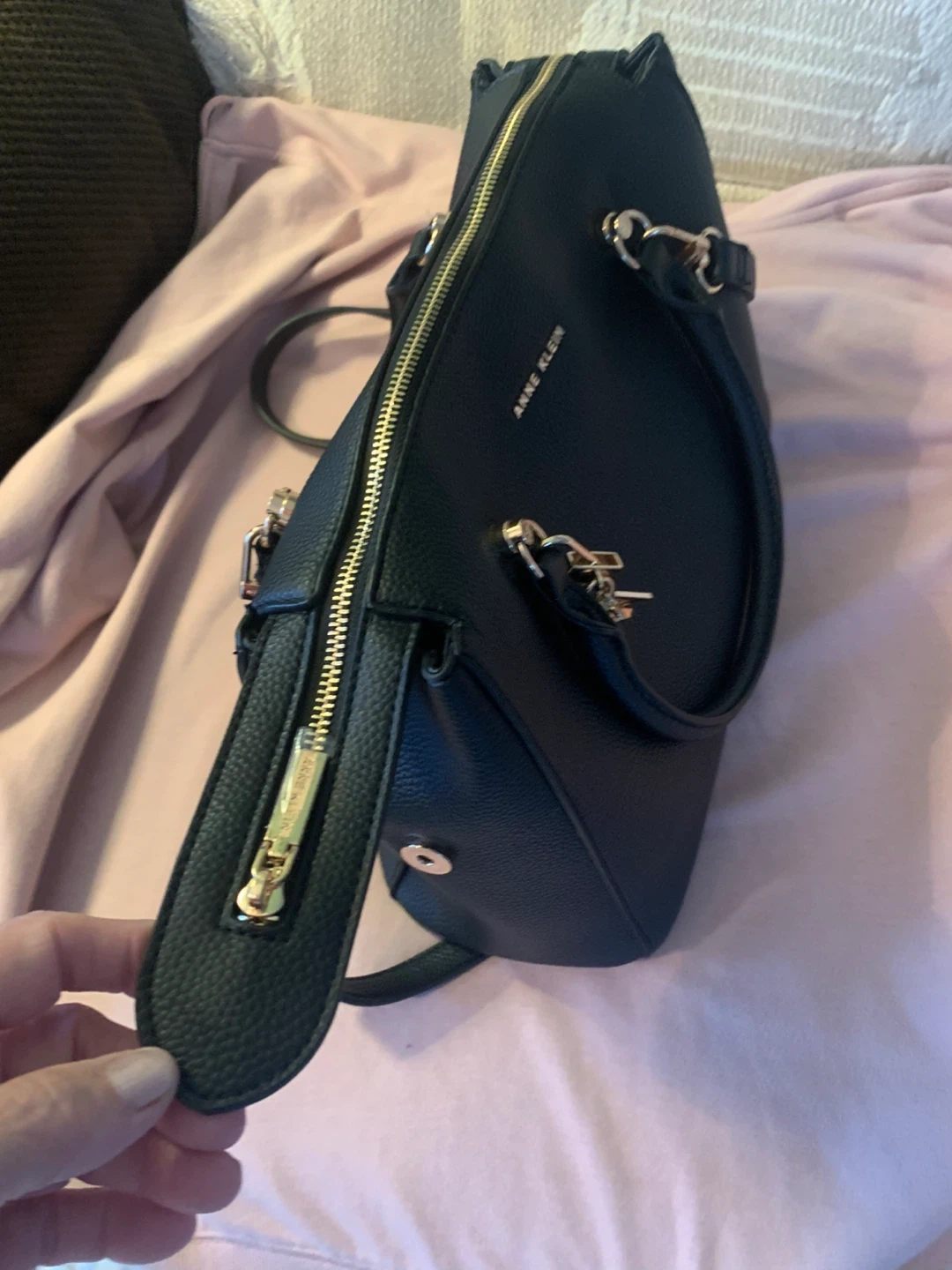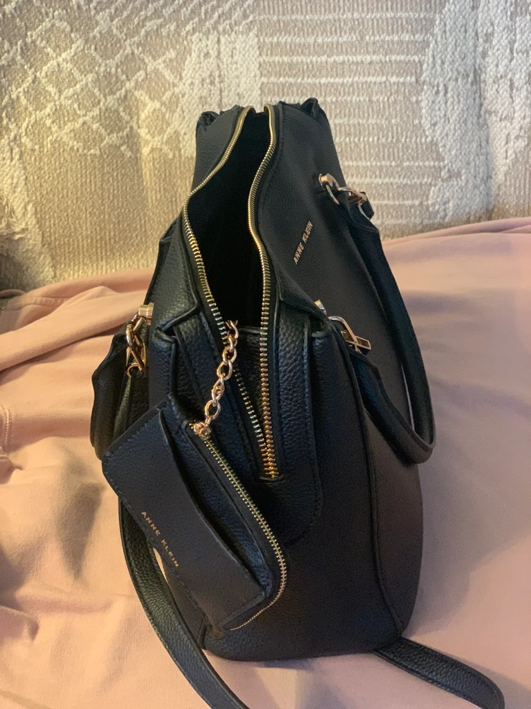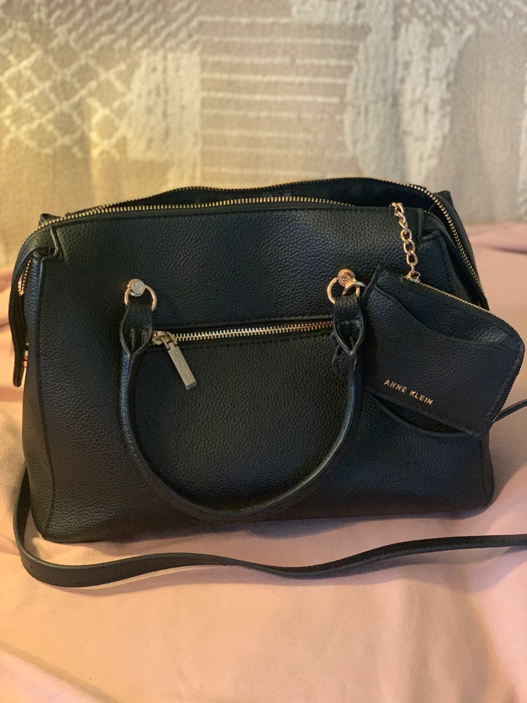 Brand new Anne Klein black, faux leather purse. Shoulder strap & handles. Small zippered outer pocket at the back. 2 large compartments inside with a large, zippered compartment separating them. Also an inside zippered compartment and 2 small slide compartments. Also has a small zippered credit card/coin purse inside.