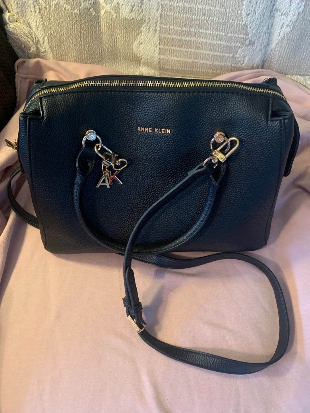 Brand new Anne Klein black, faux leather purse. Shoulder strap & handles. Small zippered outer pocket at the back. 2 large compartments inside with a large, zippered compartment separating them. Also an inside zippered compartment and 2 small slide compartments. Also has a small zippered credit card/coin purse inside.