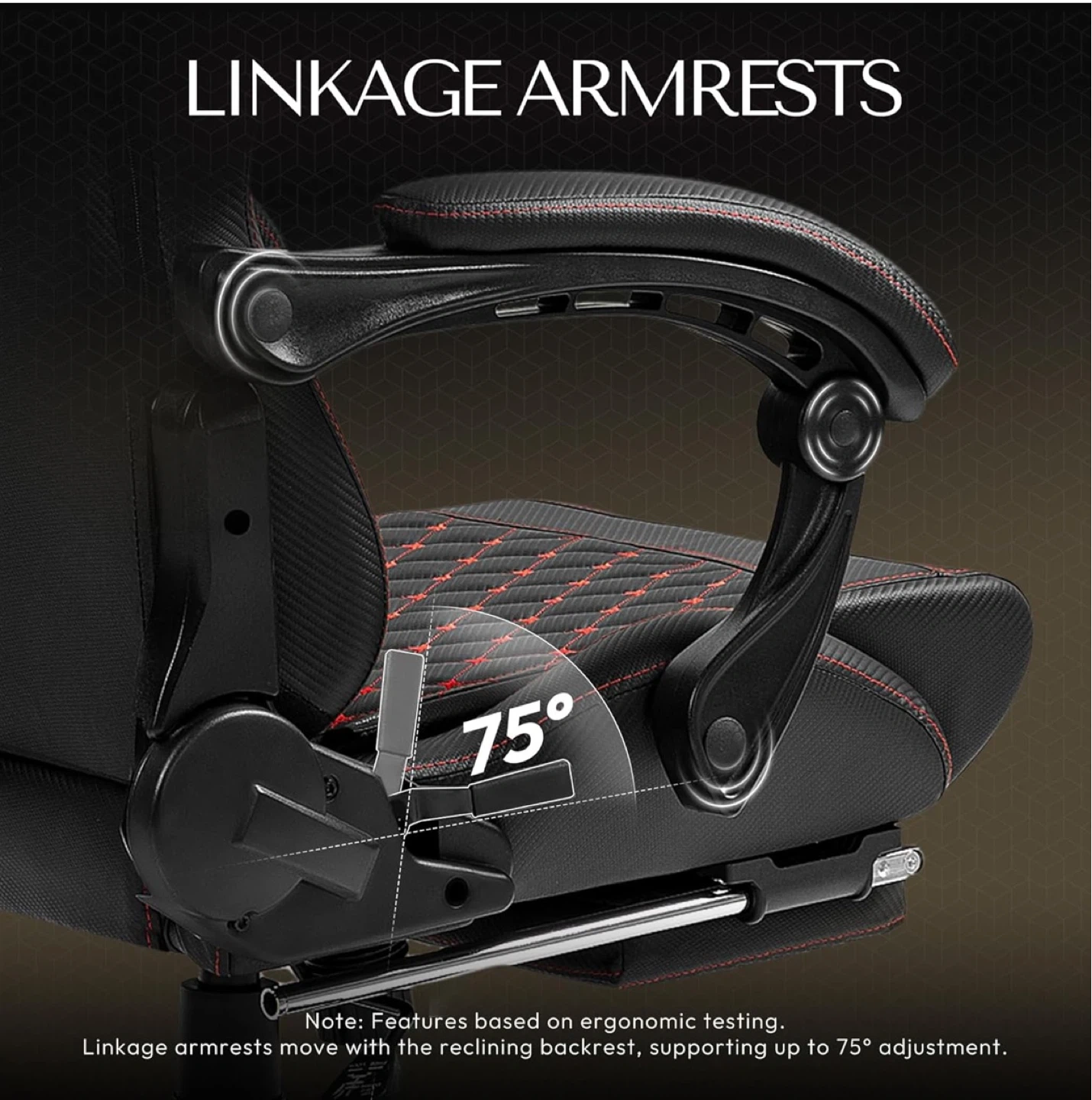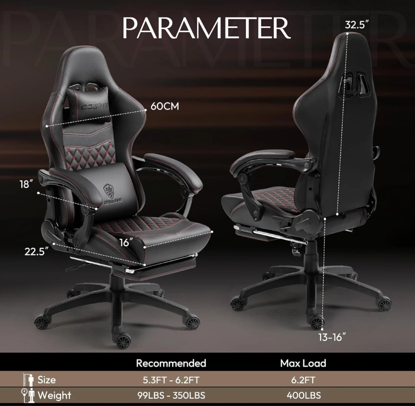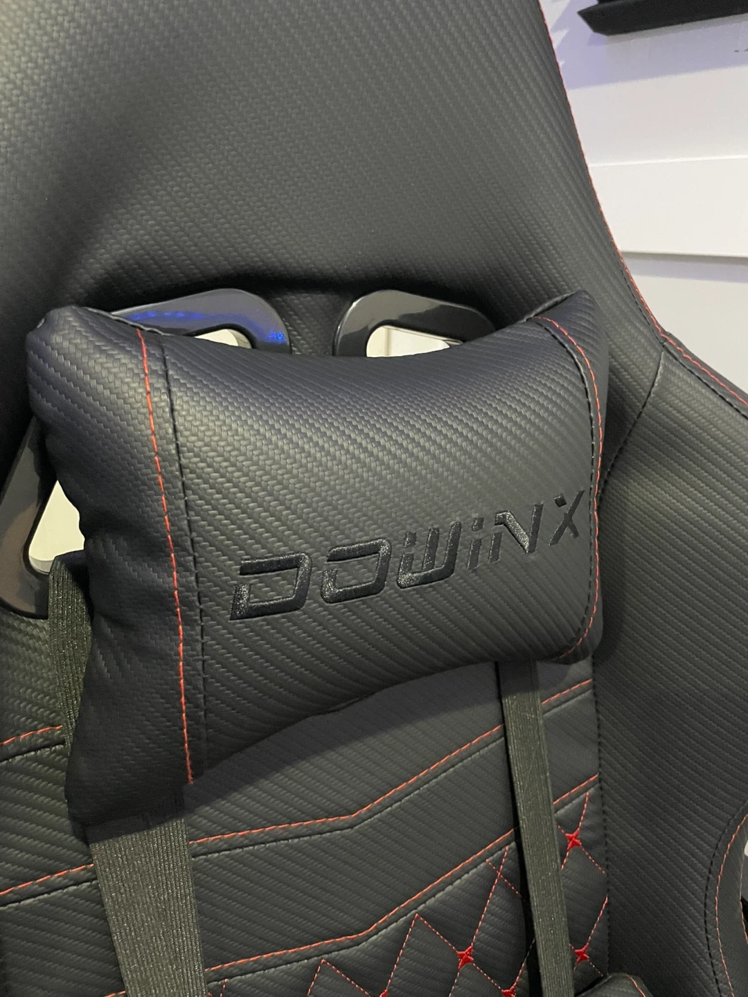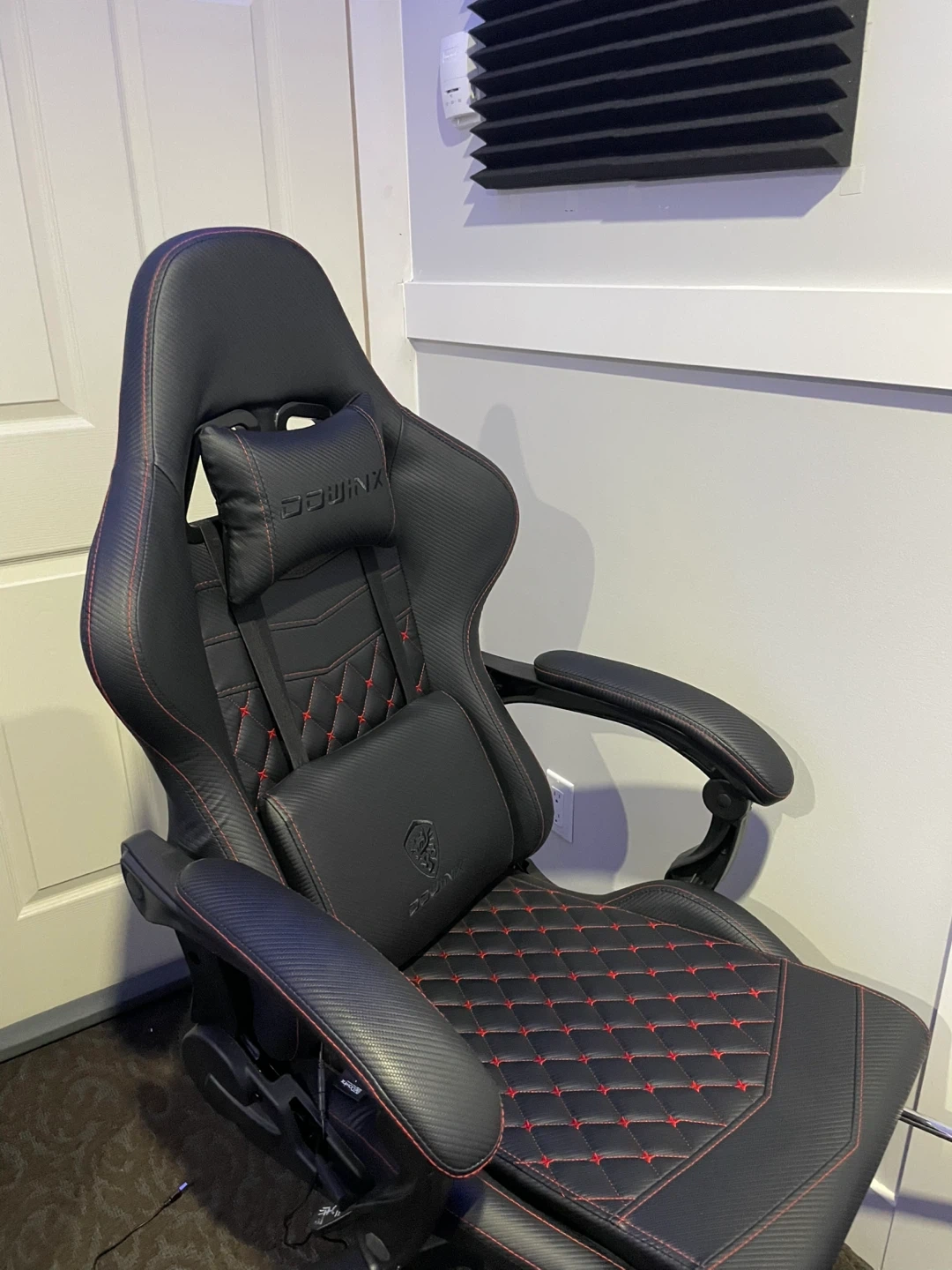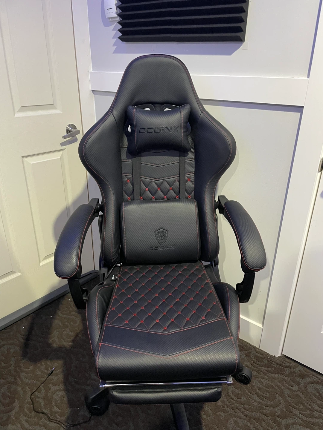 This gaming chair is upholstered in black faux leather with stitching. It features adjustable lumbar support and a retractable footrest for added comfort, as well as a massaging function and a head pillow for support. Brand new, only tested once at a desk. Originally bought for $300.