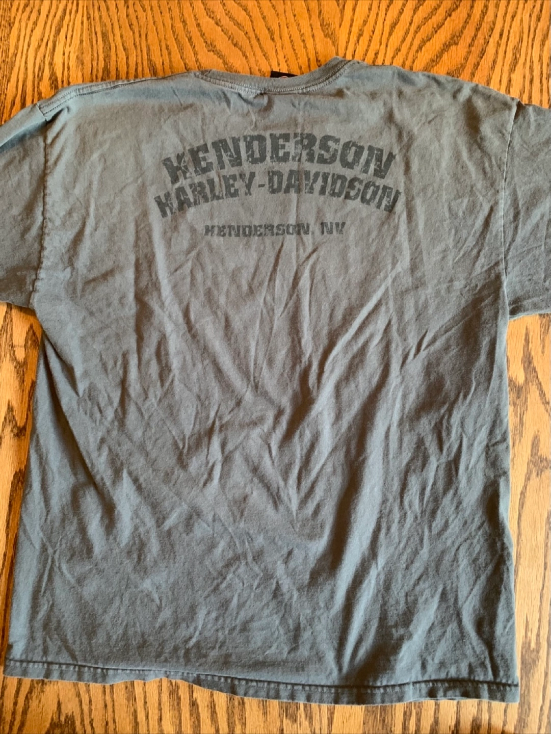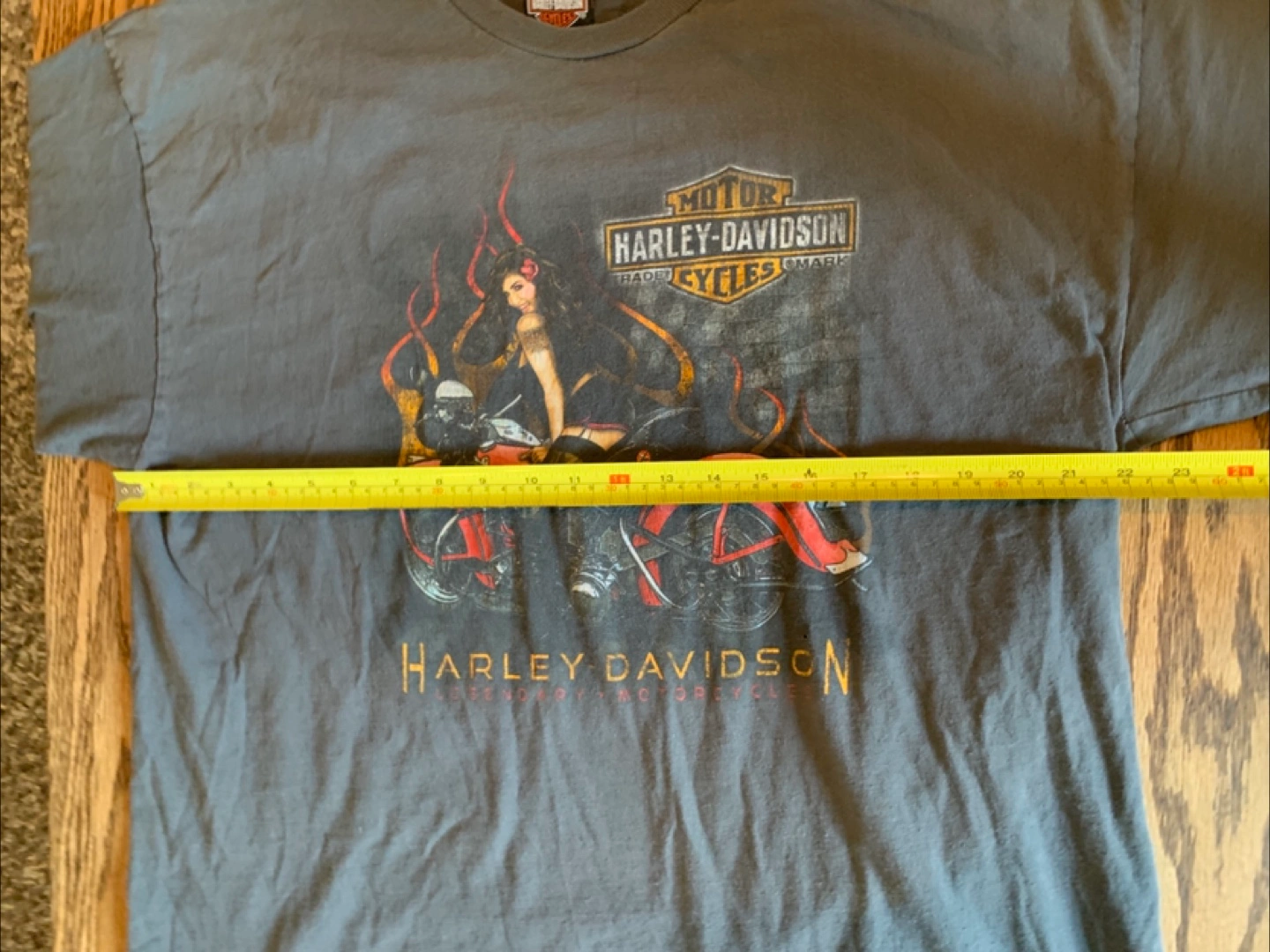 Harley-Davidson t-shirt. The shirt is a grey colour with a motorcycle and woman graphic.