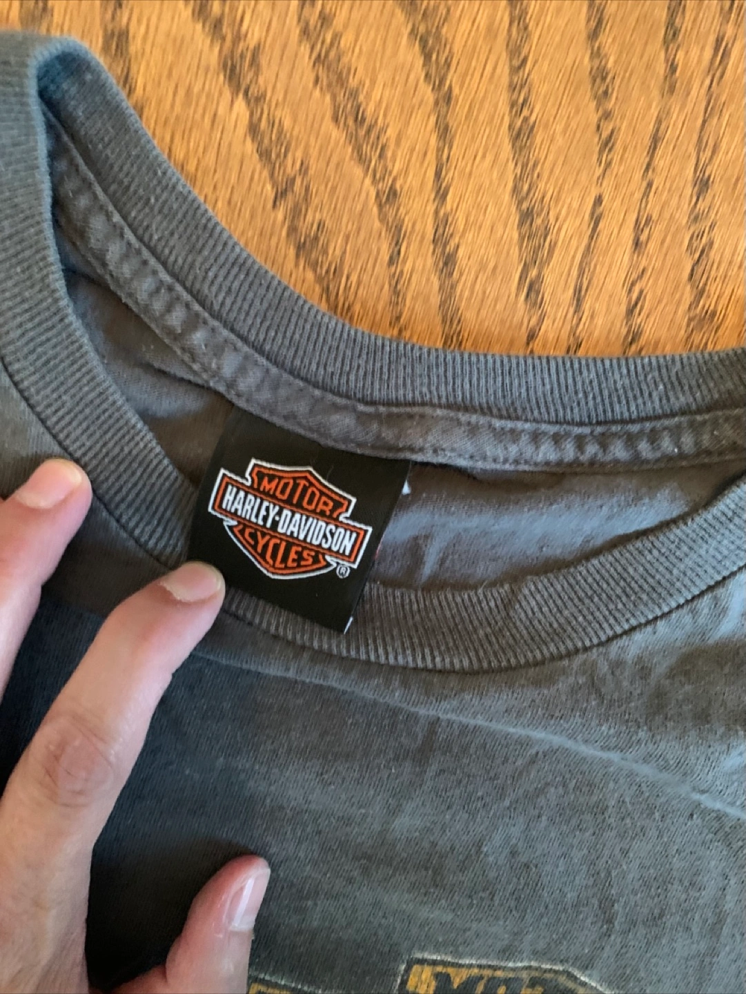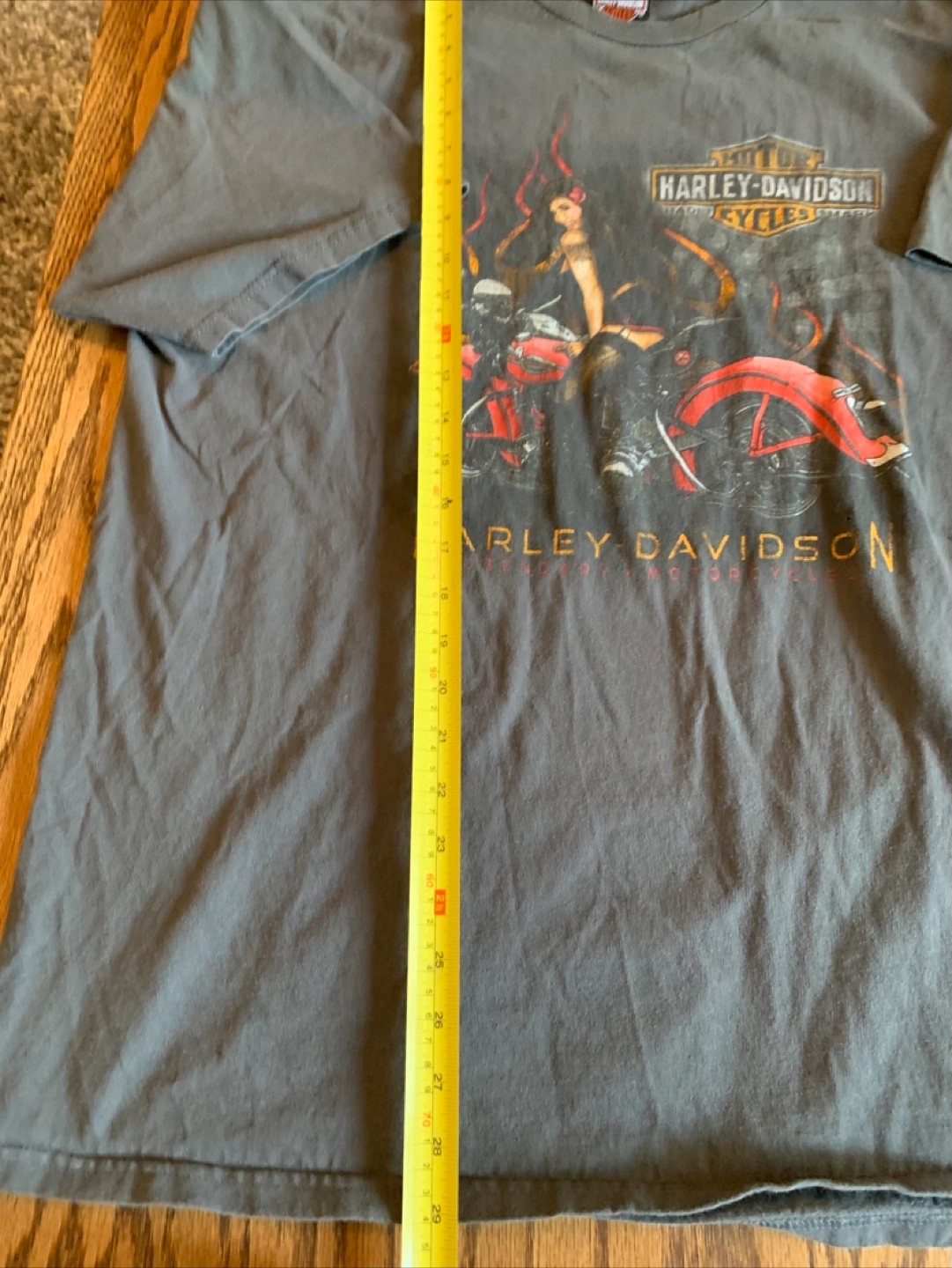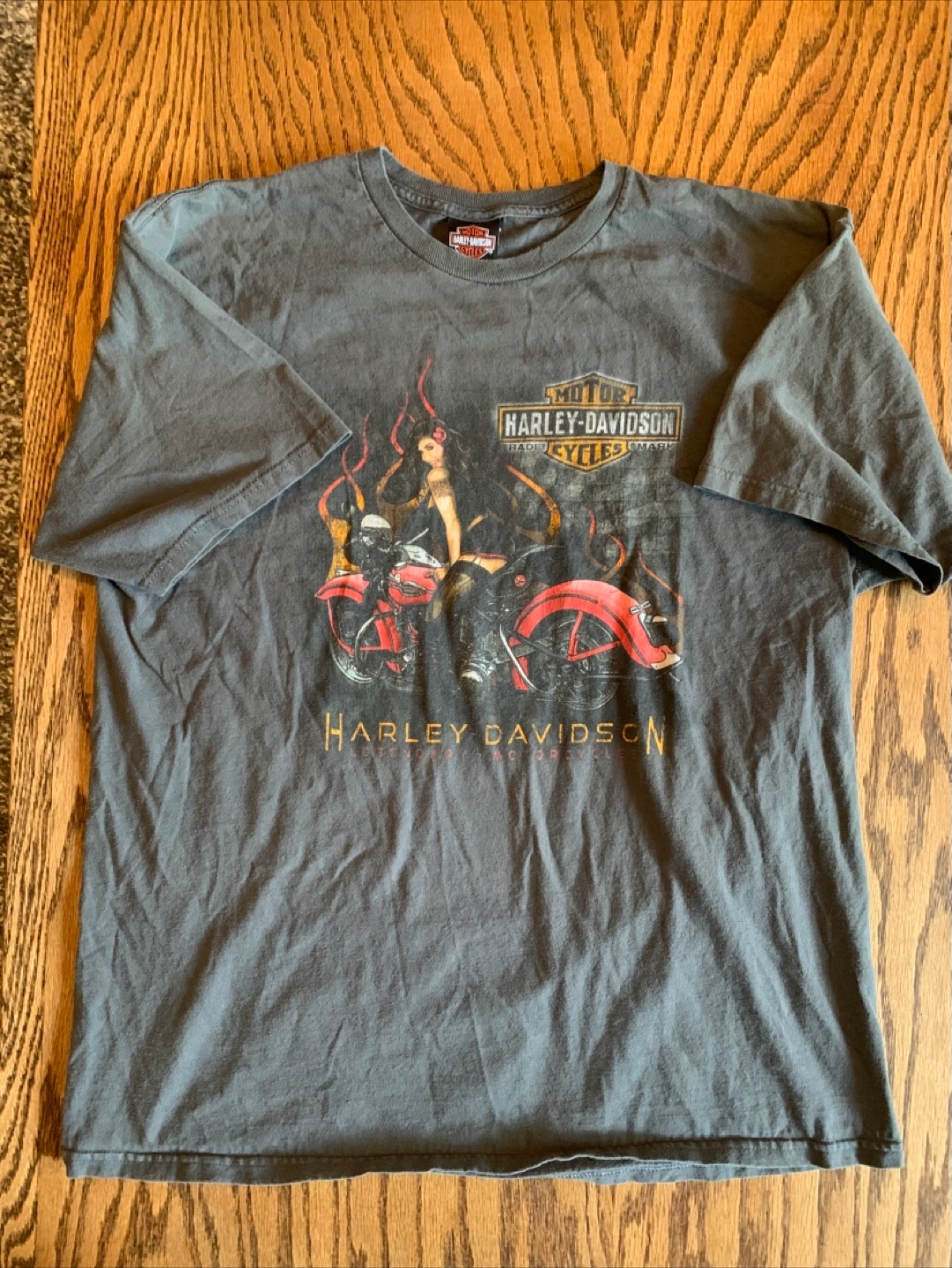 Harley-Davidson t-shirt. The shirt is a grey colour with a motorcycle and woman graphic.