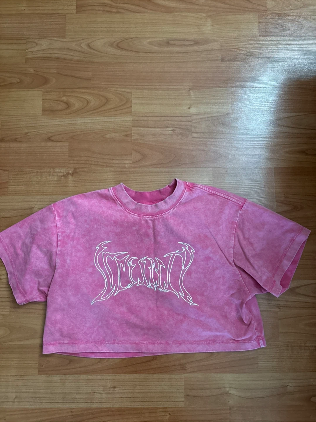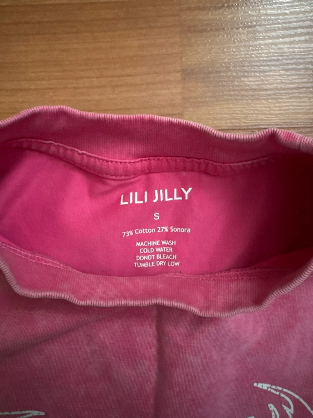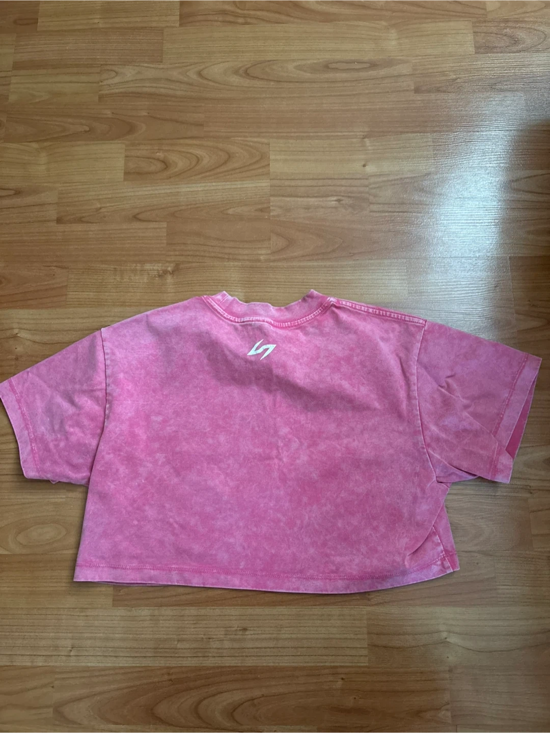 This is a pink cropped t-shirt from LILI JILLY (small business) It's size small and made of 73% cotton and 27% Sonora. The shirt has a unique tie-dye effect and the material is made for sweat wicking during exercise