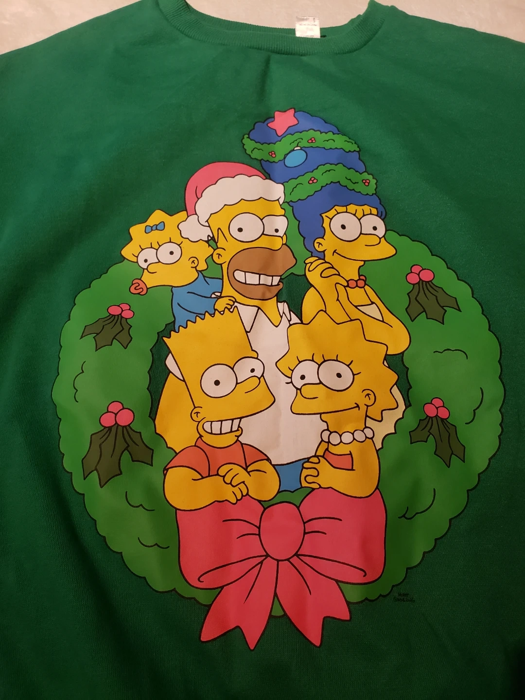 Green crewneck sweatshirt featuring The Simpsons family in a festive wreath design. It's a size medium. This cozy sweater is great for holiday gatherings! Never worn before.