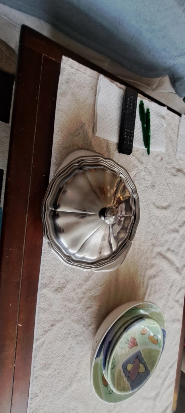 A decorative silver-plated serving dish with a matching lid. Its elegant fluted design makes it perfect for special occasions or everyday use. A great addition to any kitchenware collection!