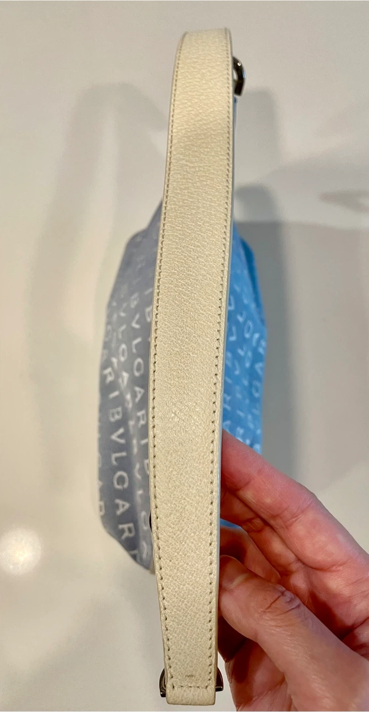 Here's a cute Bvlgari shoulder bag! It's a light blue canvas material with the Bvlgari logo printed all over. The interior is a bright green colour. The strap drop is about 8 inches.