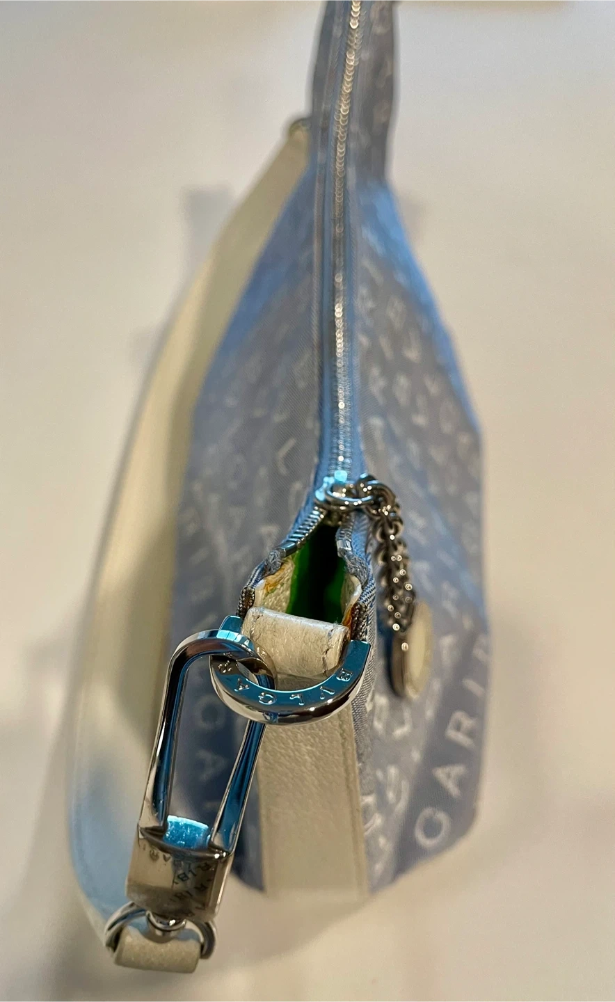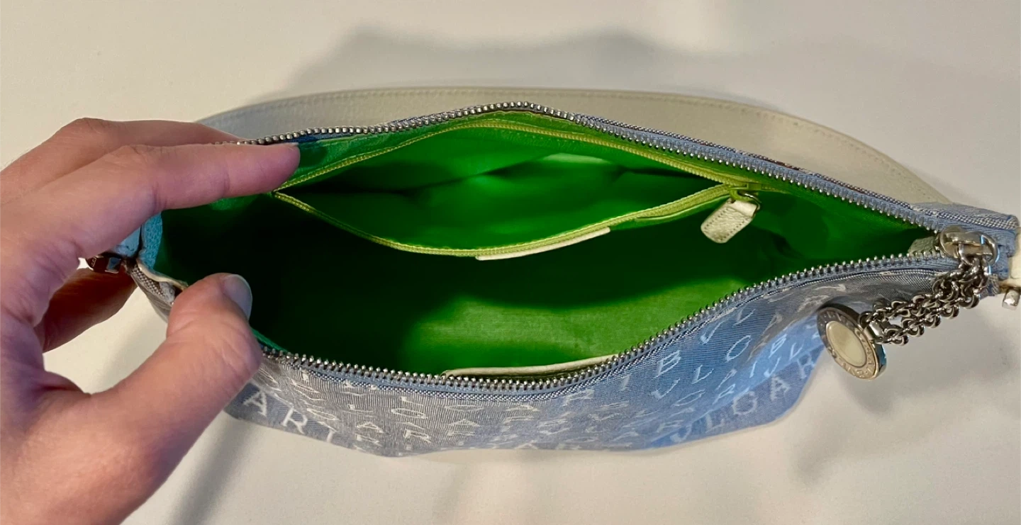 Here's a cute Bvlgari shoulder bag! It's a light blue canvas material with the Bvlgari logo printed all over. The interior is a bright green colour. The strap drop is about 8 inches.