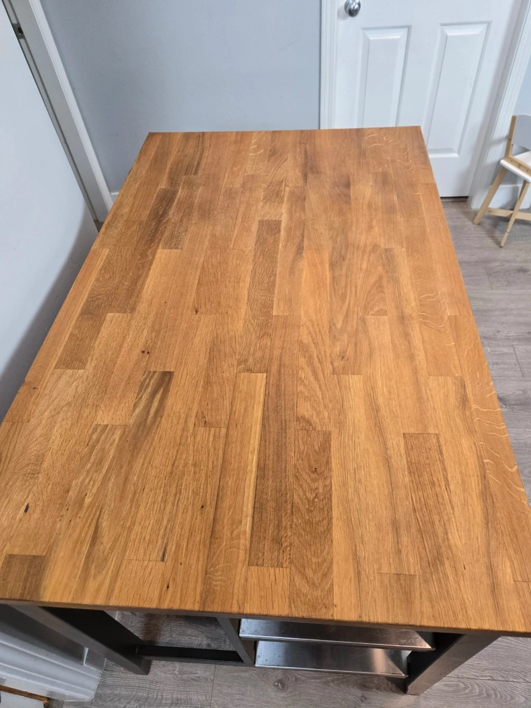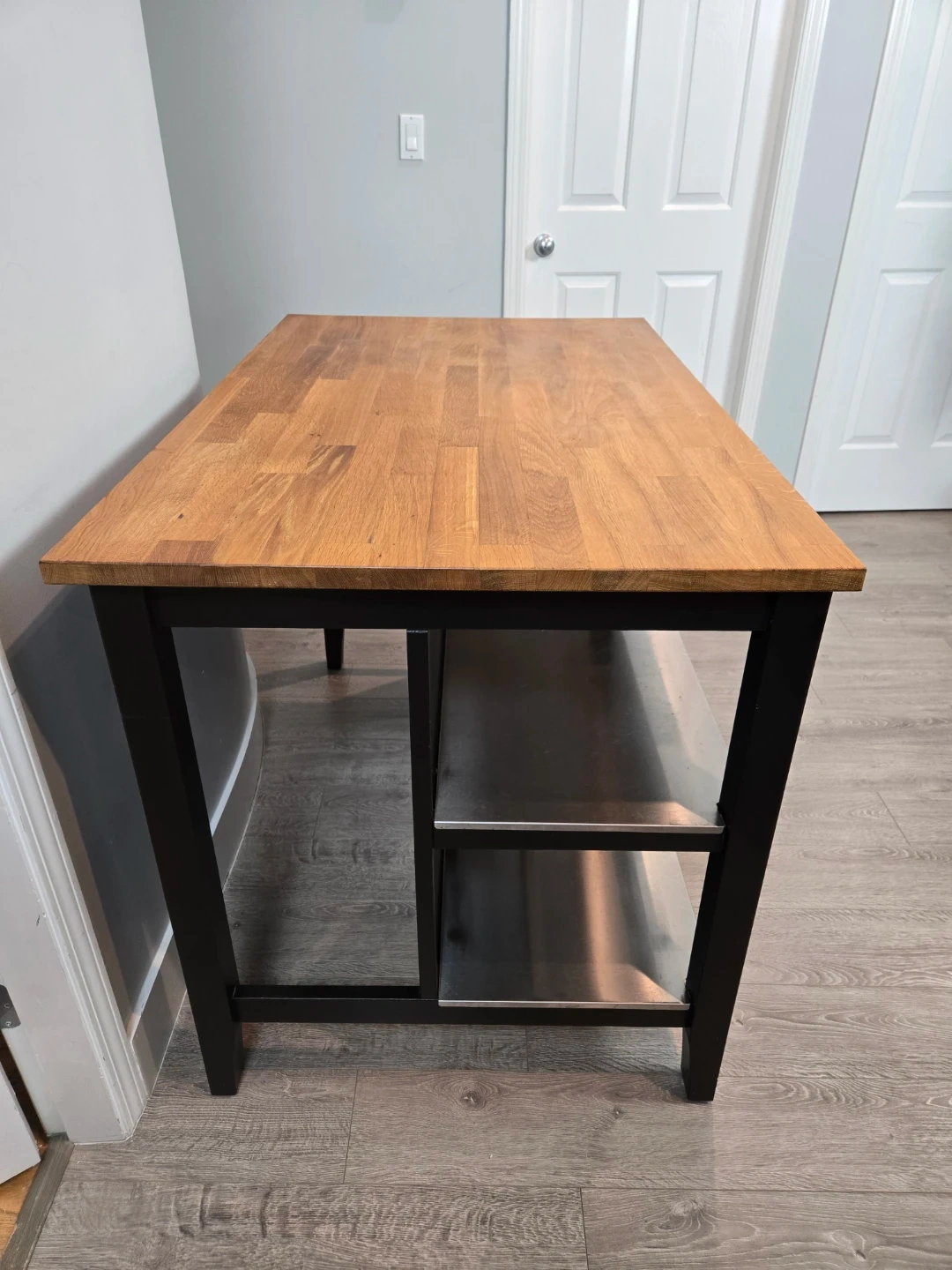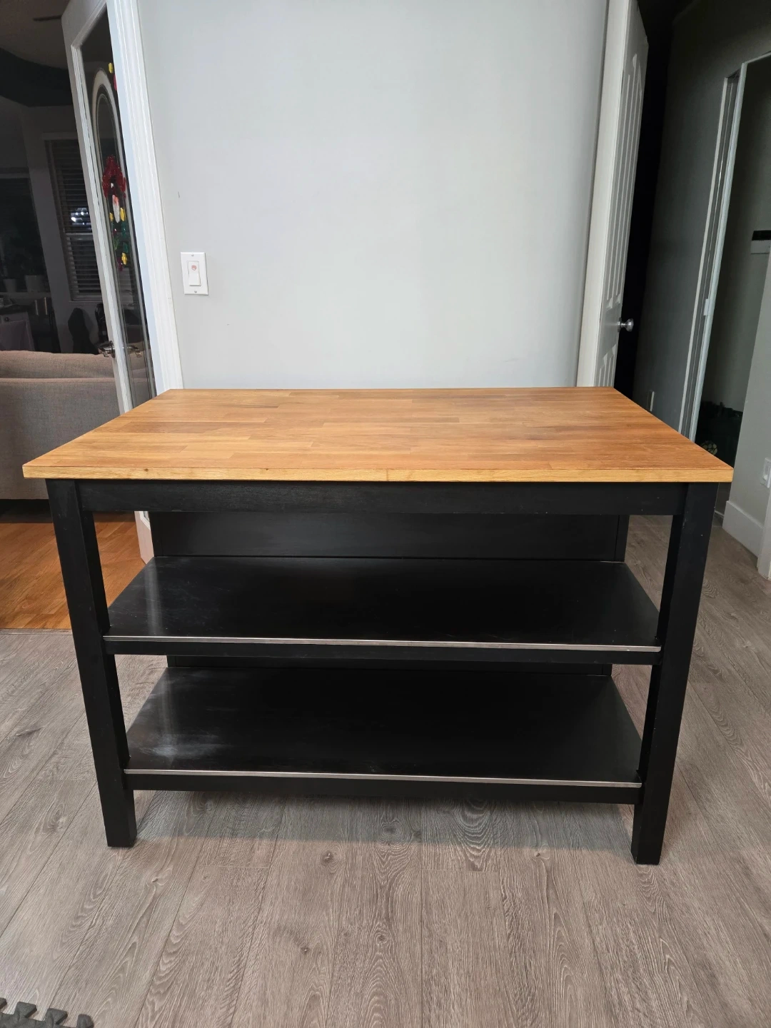 Newly refinished large stenstorp kitchen island with butcher block.