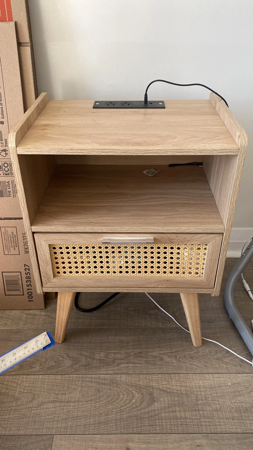 Selling a cute oak wood nightstand! It features a stylish wicker drawer and a convenient power outlet on top. Perfect for adding a touch of natural warmth to your bedroom