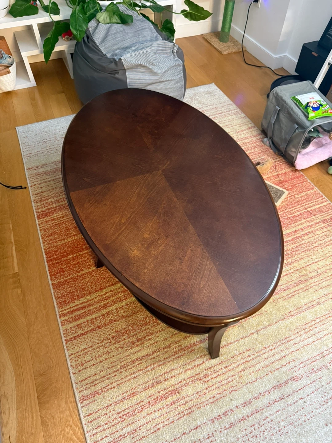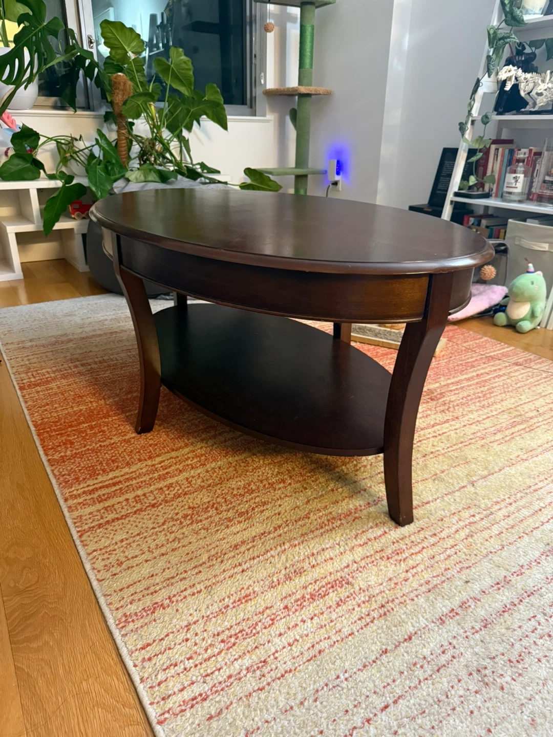 Selling a beautiful oval coffee table with a dark wood finish. It has a classic design that would look great in any living room. It features a lower shelf for storage or decor.